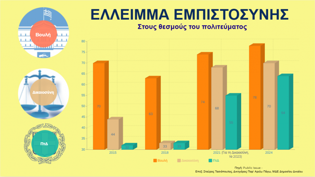 Τα στοιχεία της έρευνας της Public Issue – Εμπιστοσύνη στους Θεσμούς, για το 2024, δείχνουν ότι οι πολίτες, σε ποσοστό 70%, δεν εμπιστεύονται τη Δικαιοσύνη, δηλαδή τον θεσμό που καλείται να ελέγξει τους άλλους δύο θεσμούς και να αποδώσει δικαιοσύνη για τον πολίτη, με βάση την ισχύουσα εκάστοτε νομοθεσία και ερμηνεία επί των νόμων, ενώ σε ποσοστό 78%, δεν εμπιστεύονται τη Βουλή και την Κυβέρνηση, δηλαδή όσους παράγουν και ψηφίζουν τα νομοθετήματα, ενώ σαφή έλλειψη εμπιστοσύνης καταγράφεται και για τον Πρόεδρο της Δημοκρατίας, σε ποσοστό 64%.