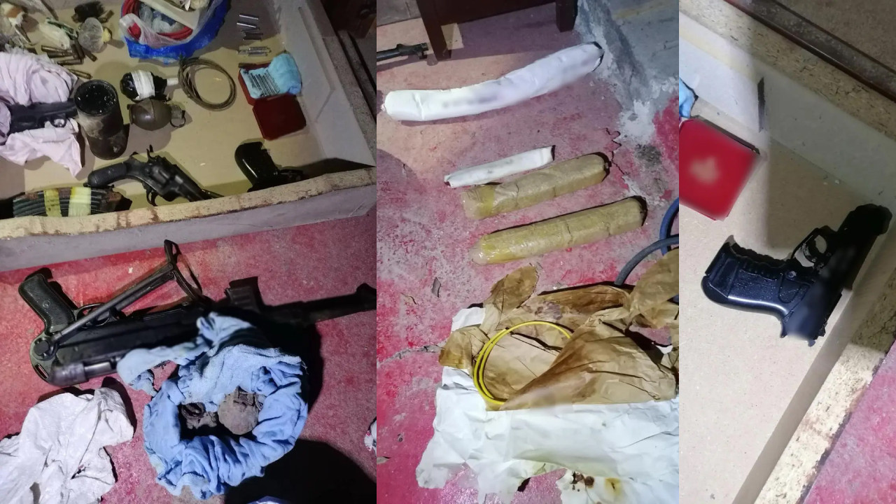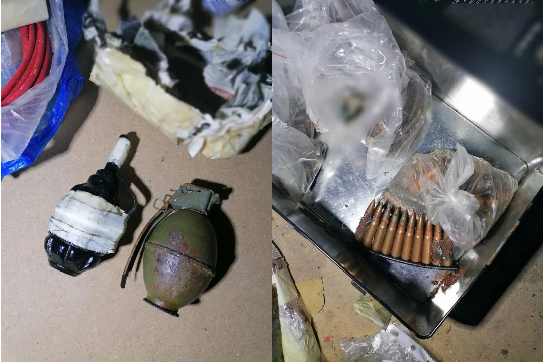 Μέσα στο ξυλουργείο, οι αστυνομικοί βγήκαν συνολικά δύο πιστόλια, χειροβομβίδες, σφαίρες, εκρηκτική ύλη, αλλά και το καλάσνικοφ με το οποίο πυροβολούσε νωρίτερα ο 60χρονος.