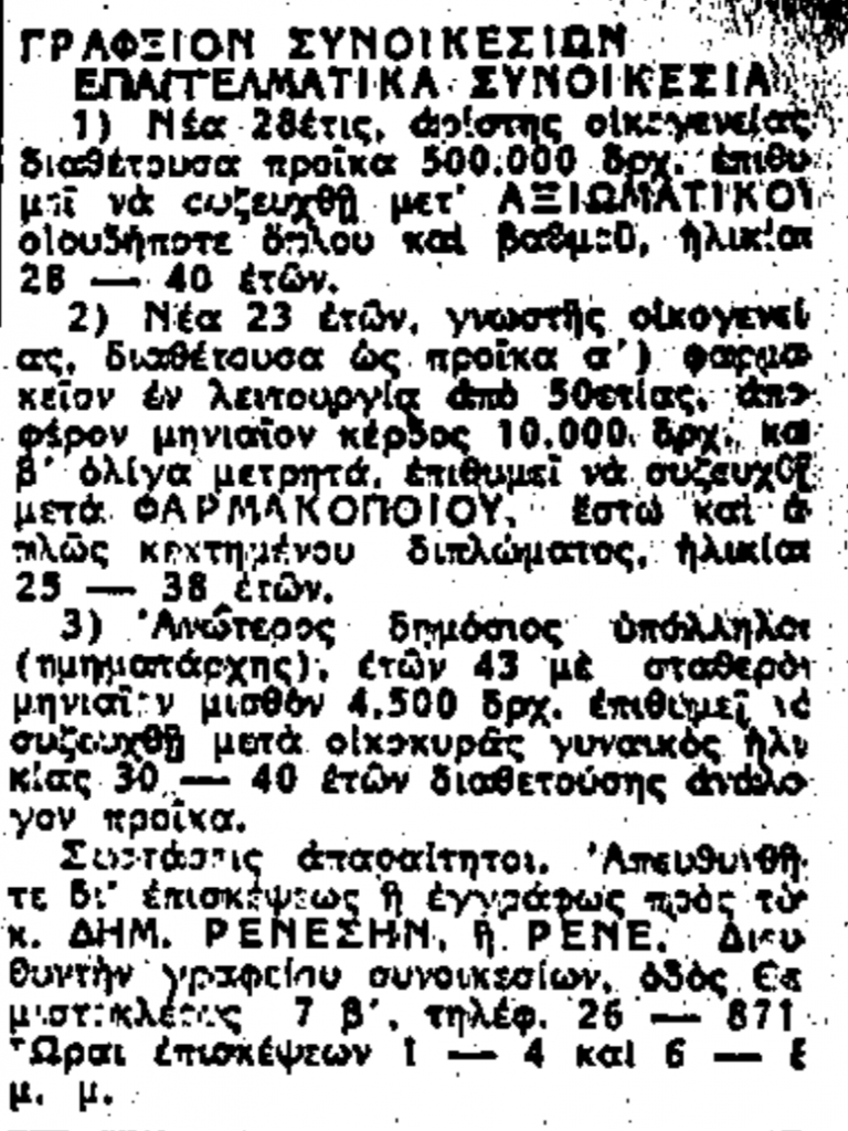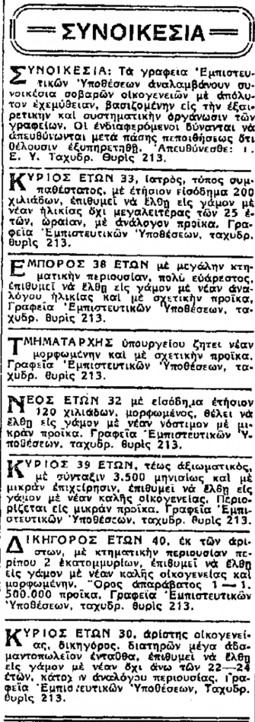 Η παραπάνω άποψη του συντάκτη των «ΑΘΗΝΑΪΚΩΝ ΝΕΩΝ» φαίνεται να επιβεβαιώνεται και από μια από τις πιο αντικειμενικές πηγές ενημέρωσης για τα τεκταινόμενα της κάθε εποχής: τις αγγελίες. Μια ματιά θα σας πείσει: