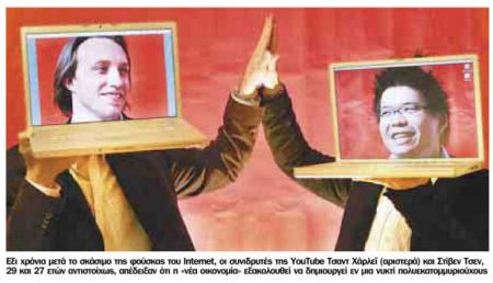 »Σύμφωνοι, η YouTube μεσολαβεί για τη διανομή μέσω Διαδικτύου περίπου 100 εκατ. βιντεοκλίπ ημερησίως. Και κάθε μήνα την επισκέπτονται περί τα 72 εκατ. χρήστες. Αλλά πρόκειται για μια επιχείρηση της λεγόμενης “νέας οικονομίας” (αυτής που κατέρρευσε μόλις προ εξαετίας…) που απασχολεί μόλις 67 εργαζόμενους και δεν έχει καταφέρει ακόμα να καταστήσει εμπορικά εκμεταλλεύσιμες τις υπηρεσίες που προσφέρει. Βεβαίως εμπορικά εκμεταλλεύσιμη – για την ακρίβεια “χρυσωρυχείο” – αποδεικνύεται η ίδια YouTube. Και αυτό γιατί μετέτρεψε εν μία νυκτί σε πολυεκατομμυριούχους τους δύο συνιδρυτές της ιστοσελίδας. Πρόκειται για τον ηλικίας 29 ετών Τσαντ Χάρλεϊ και των δύο χρόνια νεότερο του Στιβ Τσαν που θα ενθυλάκωση πάνω από μισό δις. δολάρια έκαστος!