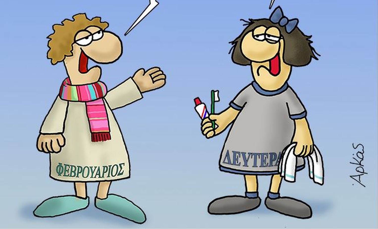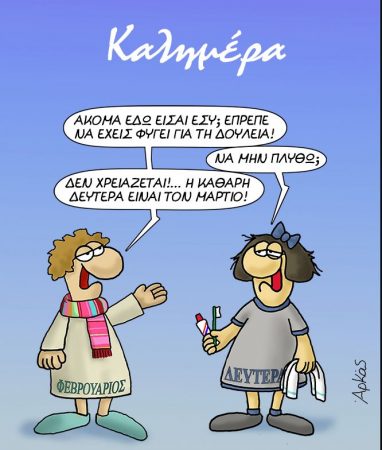 Ο Φεβρουάριος λοιπόν απευθυνόμενος στη Δευτέρα, την ψέγει. Ο λόγος; Γιατί έχει καθυστερήσει, δεν έχει φύγει ακόμη για τη δουλειά της. Τότε εκείνη δικαιολογείται λέγοντας πώς χρειάζεται λίγο χρόνο για φροντίσει την πρωϊνή υγιεινή της για να λάβει από τον Φεβρουάριο, αποστομωτική απάντηση που χαρίζει το γέλιο. Ακολουθεί ο διάλογος του ευφάνταστου σκίτσου: