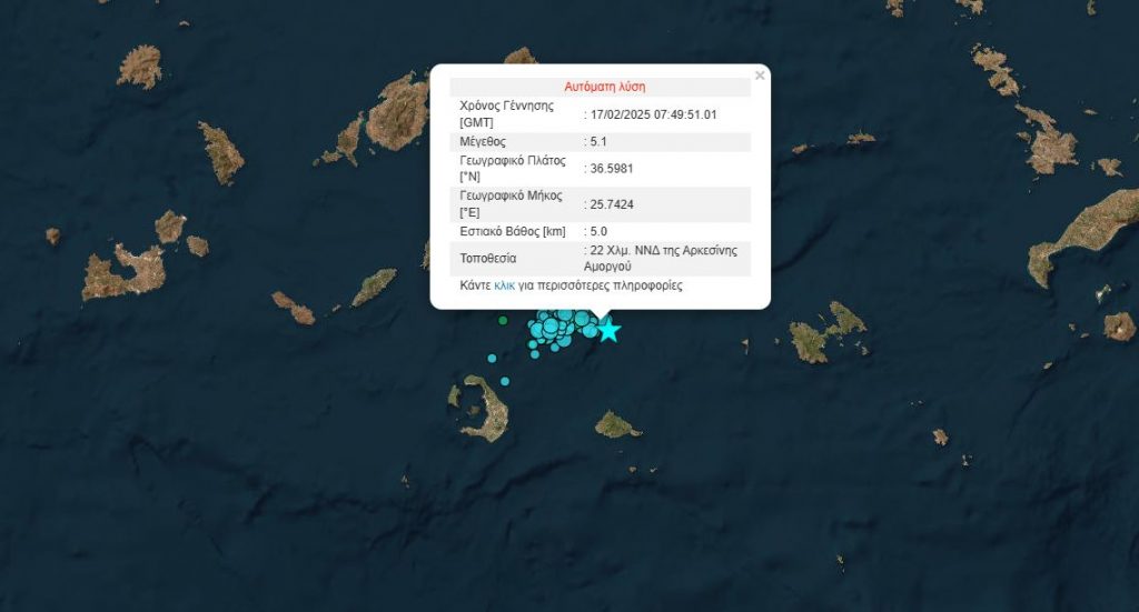 Νέος ισχυρός σεισμός μεγέθους 5,1 βαθμών της κλίμακας Ρίχτερ σημειώθηκε το πρωί της Δευτέρα (17/2) στην Αμοργό.