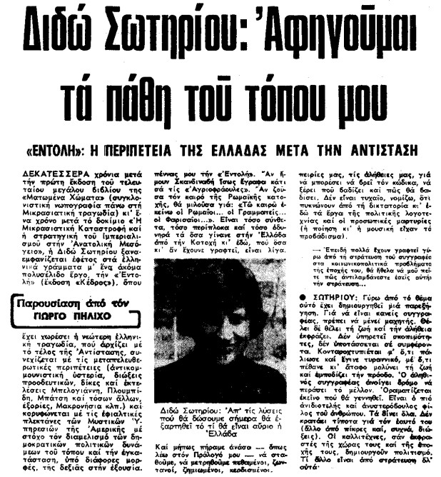 Στις 9 Δεκεμβρίου του 1976, ο Γιώργος Πηλιχός και «ΤΑ ΝΕΑ» δημοσιεύουν συνέντευξη της Διδώς Σωτηρίου, της συγγραφέως που αφηγήθηκε όπως λίγοι τις περιπέτειες του ελληνισμού κατά τον 20ο αιώνα.
