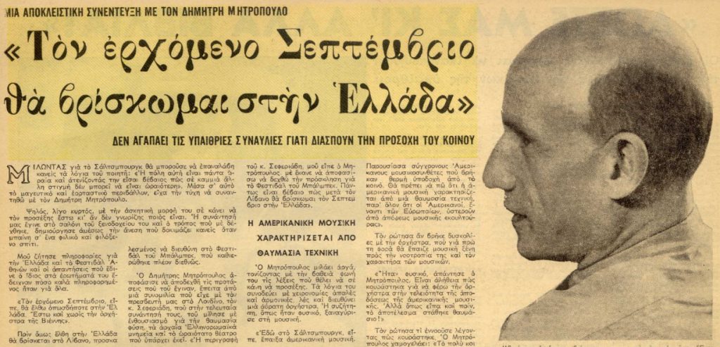 Δύο χρόνια, περίπου, αργότερα, ο «ΤΑΧΥΔΡΟΜΟΣ» της 21ης Σεπτεμβρίου 1957, φιλοξενεί συνέντευξη του Δημήτρη Μητρόπουλου στον Ορέστη Λαζαρίδη. Ο Μητρόπουλος κατέγραψε μια εντυπωσιακή, παγκόσμιας φήμης, διεθνή καριέρα, διευθύνοντας κορυφαίες ορχήστρες. Την περίοδο εκείνη ο Δημήτρης Μητρόπουλος βρίσκεται στο Σαλτσμπουργκ της Αυστρίας, συνεργαζόμενος με τη συμφωνική ορχήστρα της Βιέννης.