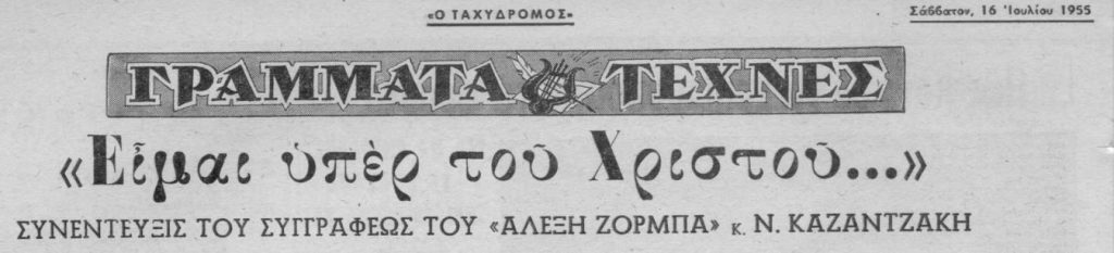 Ο «ΤΑΧΥΔΡΟΜΟΣ» της 16ης Ιουλίου 1955 δημοσιεύει συνέντευξη του σπουδαίου και πολυμεταφρασμένου συγγραφέα, ο οποίος, μεταξύ άλλων, αναφέρει, από την γαλλική πόλη Αντίμπ όπου ζούσε με τη σύζυγό του, Γαλάτεια: