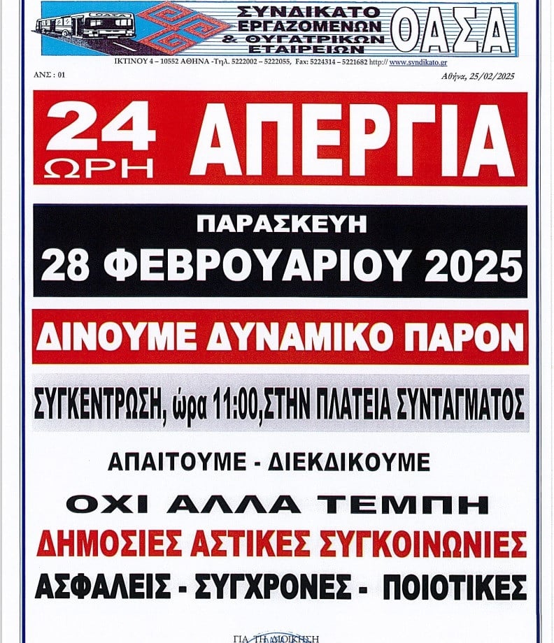 24ωρη απεργία στα λεωφορεία και τα τρόλεϊ την Παρασκευή 28 Φεβρουαρίου αποφάσισε να πραγματοποιήσει το Συνδικάτο Εργαζομένων ΟΑΣΑ και η Ένωση Εργαζομένων ΗΛΠΑΠ. Αν δεν υπάρξει κάποια άλλη απόφαση, κανονικά αναμένεται να κυκλοφορήσουν τα λεωφορεία στις γραμμές της Ανατολικής και Δυτικής Αττικής που έχουν παραχωρηθεί σε ιδιώτες.