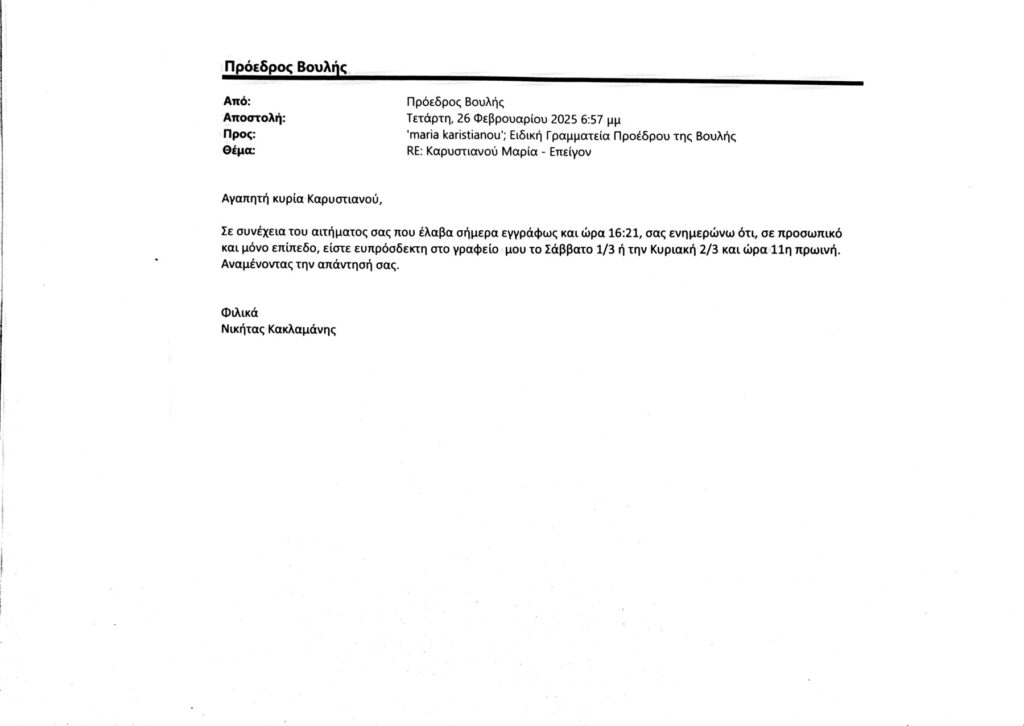 «Η συνάντηση αυτή ούτε προσωπικό χαρακτήρα έχει, ούτε και εθιμοτυπικό ή άλλο, καθώς ζητήθηκε αποκλειστικά και μόνο για ζήτημα νομικό και δη ποινικού χαρακτήρα και υψίστου κοινωνικού ενδιαφέροντος. Η δε παράσταση πολίτη μετά του δικηγόρου του ουδόλως συνεπάγεται αυτομάτως αντιδικία», απαντά η κυρία Καρυστιανού στον Πρόεδρο της Βουλής, ο οποίος την ενημέρωσε γραπτώς ότι είναι ευπρόσδεκτη στο γραφείο του το Σάββατο 1/3 ή την Κυριακή 2/3, στις 11 το πρωί, «σε προσωπικό και μόνο επίπεδο».