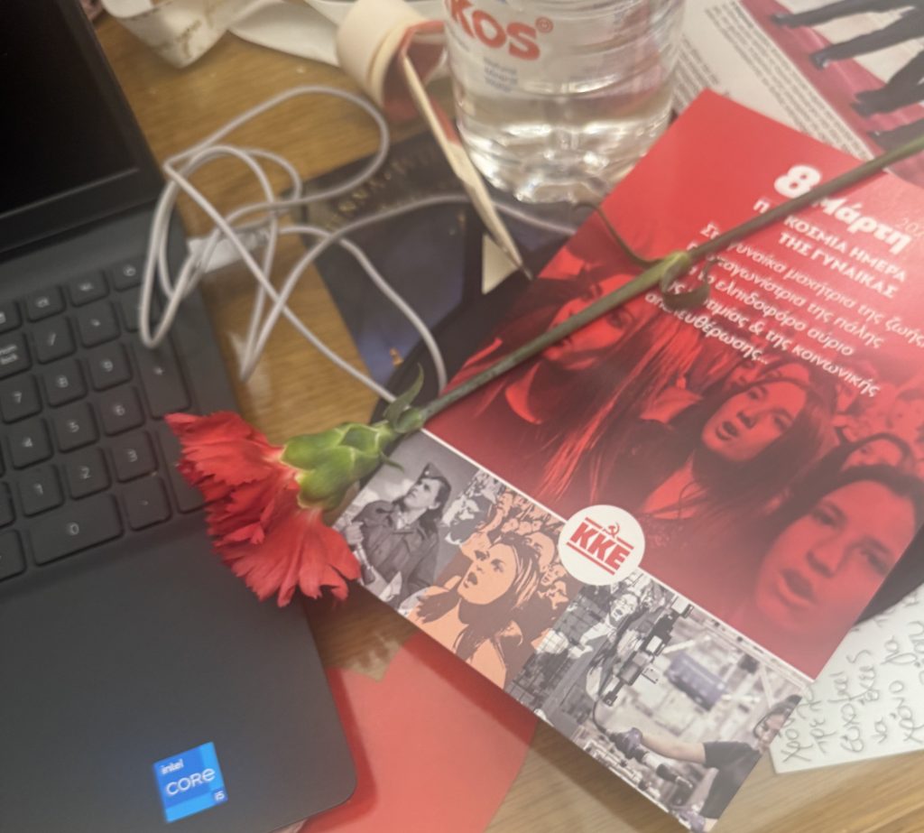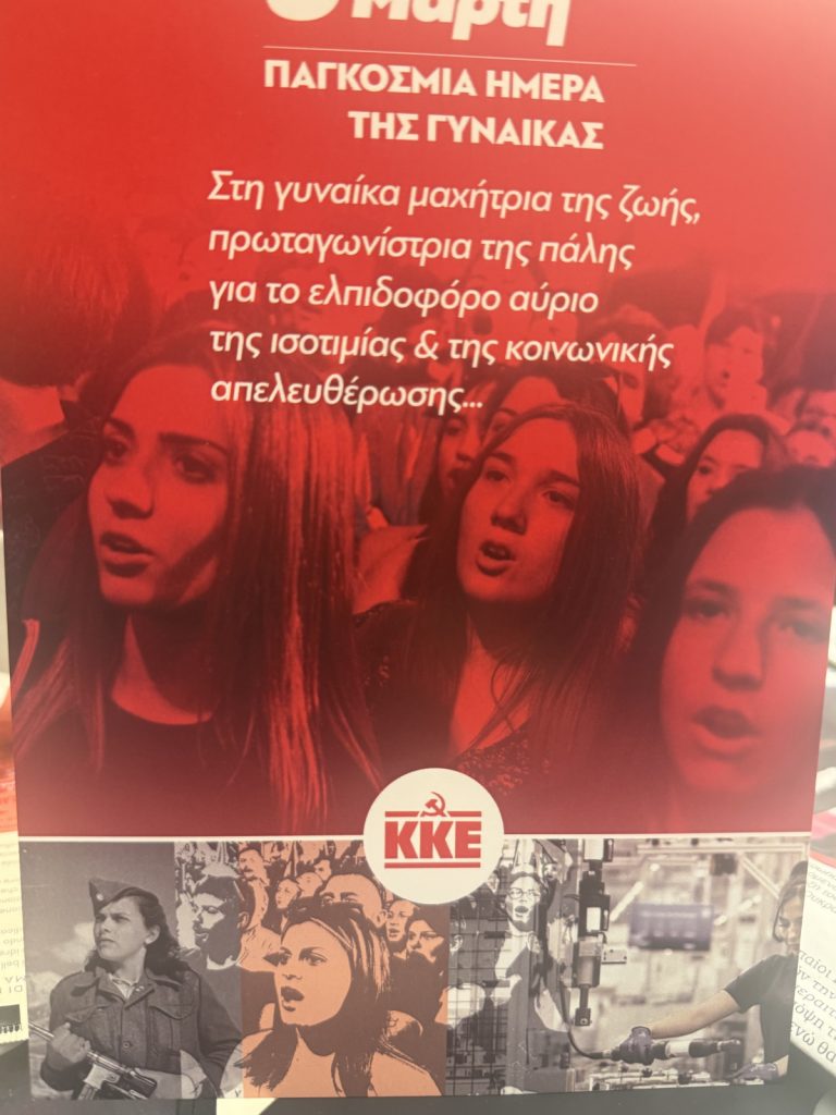 Μάλιστα, σε φυλλάδιο που μοίρασε με πρόσωπα γυναικών που ήταν αντάρτισσες, εργαζόμενες ή διαδηλώτριες αναγράφεται: «Στη γυναίκα μαχήτρια της ζωής, πρωταγωνίστρια της πάλης για το ελπιδοφόρο αύριο της ισοτιμίας και της κοινωνικής απελευθέρωσης».