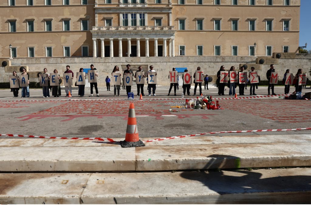 Όταν η πορεία έφτασε μπροστά από το Κοινοβούλιο, φοιτητές κρατώντας χαρτόνια σχημάτισαν σύνθημα «ή τα κέρδη τους ή οι ζωές μας».