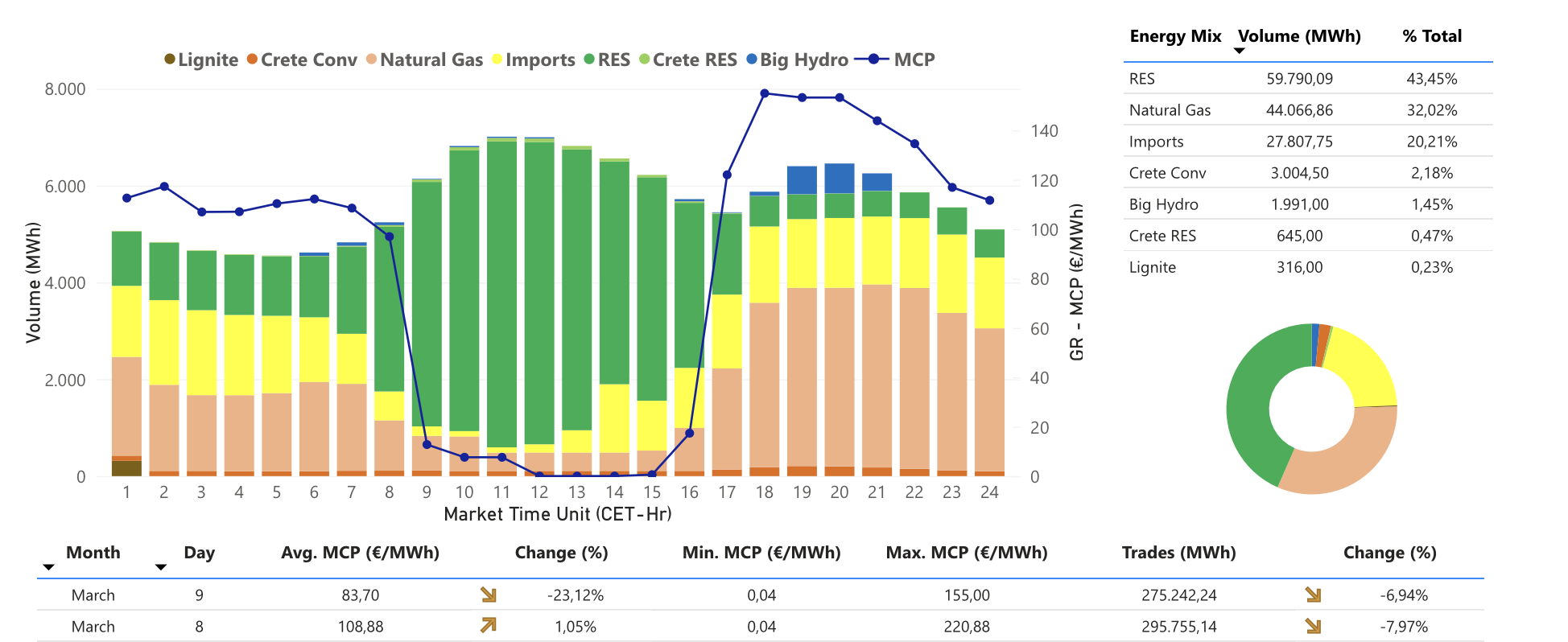 Στο σύνολο της Κυριακής 9 Μαρτίου οι ΑΠΕ κατέχουν το 43,45%, το φυσικό αέριο το 32,02% και οι εισαγωγές το 20,21% της ηλεκτροπαραγωγής.