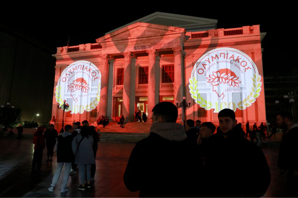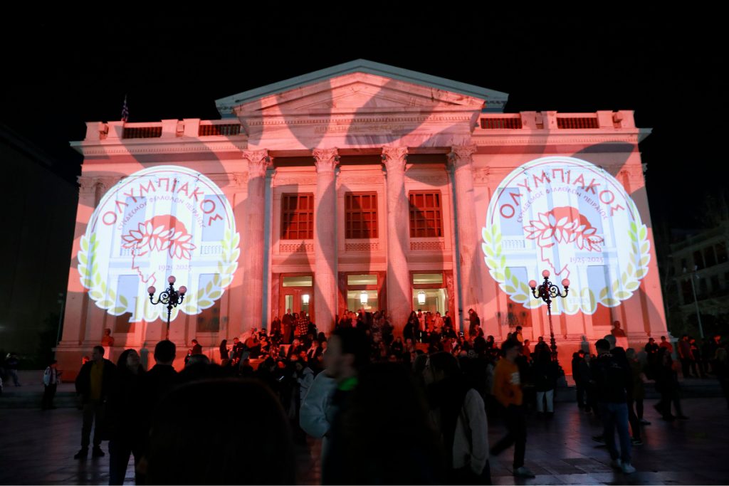 Στο πλαίσιο των εορτασμών για τα 100 χρόνια από την ίδρυση του Ολυμπιακού, το Δημοτικό Θέατρο Πειραιά φωταγωγήθηκε στα ερυθρόλευκα.