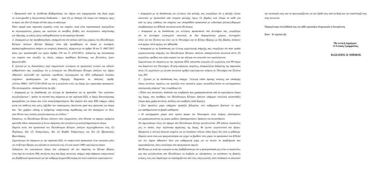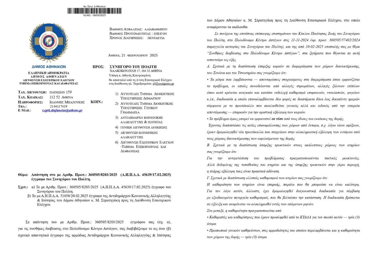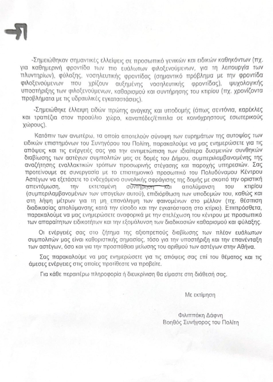 Ειδικότερα, στο απαντητικό έγγραφο που εστάλη στον Συνήγορο του Πολίτη για το Πολυδύναμο Κέντρο Αστέγων, αναφέρονται τα ακόλουθα: