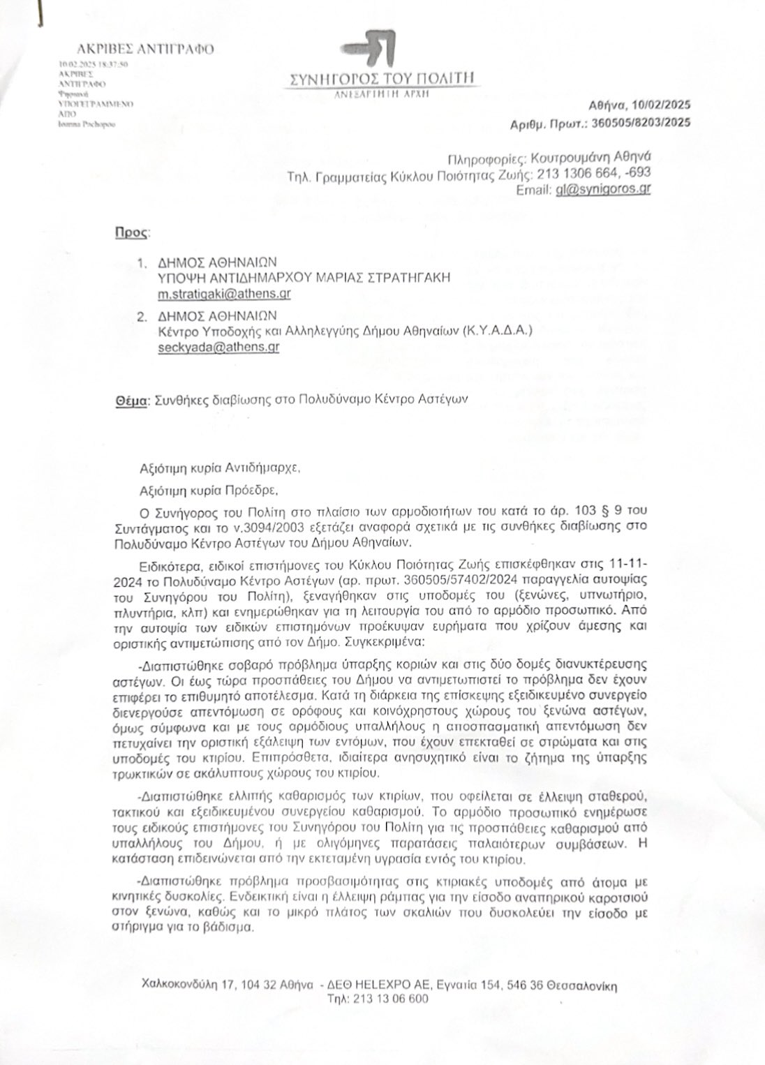 Σε έγγραφο που απέστειλε στον Δήμο η βοηθός Συνήγορος του Πολίτη, Δάφνη Φιλιππάκη, με ημερομηνία 10 Φεβρουαρίου 2025, προτείνει το συνολικό σφράγισμα της δομής που φιλοξενεί 209 άστεγους πολίτες. Ο Συνήγορος του Πολίτη κάνει λόγο για ιδιαίτερα δυσμενείς συνθήκες διαβίωσης των αστέγων συμπολιτών μας και ζητεί την αναζήτηση εναλλακτικών τρόπων προσωρινής στέγασής τους. Προτείνει τη λήψη του εν λόγω μέτρου «με σκοπό την οριστική απεντόμωση, την εκτεταμένη συντήρηση και απολύμανση του κτιρίου (συμπεριλαμβανομένων των υπογείων αυτού), επιδιόρθωση των υποδομών του, καθώς και στη λήψη μέτρων για τη μη επανάληψη των φαινομένων στο μέλλον».