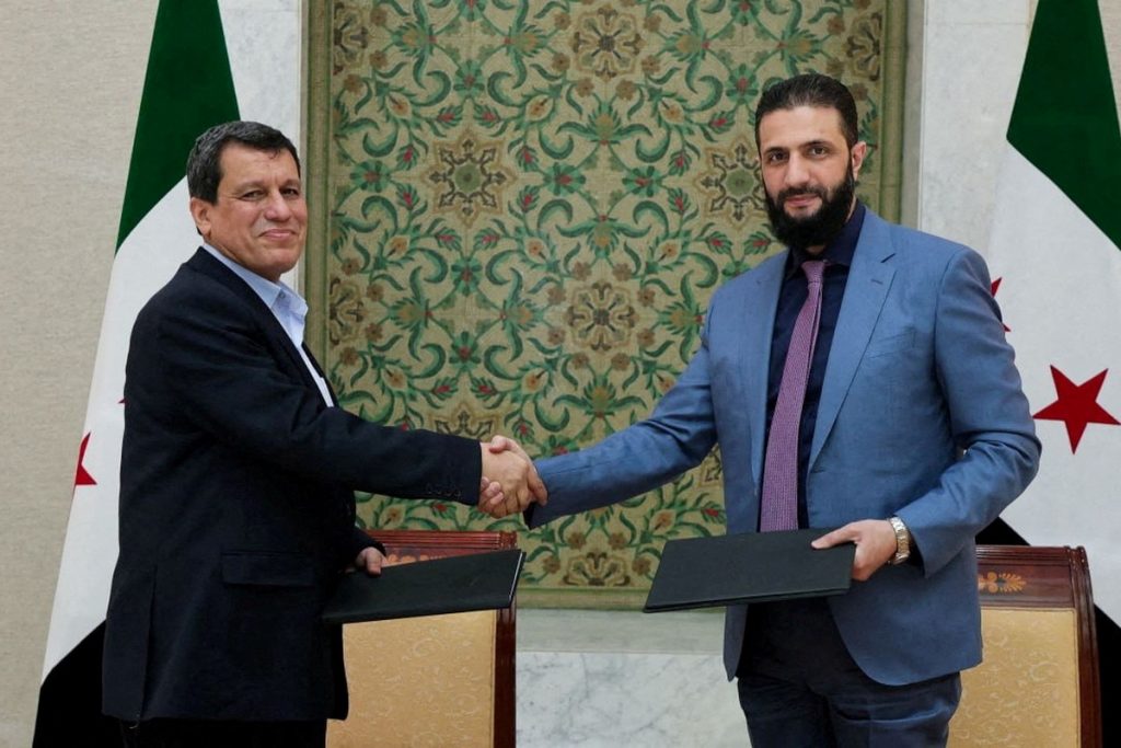 Η συμφωνία υπογράφεται από τον μεταβατικό πρόεδρο της Συρίας Άχμεντ αλ Σάρα και τον Μαζλούμ Άμπντι, τον στρατιωτικό διοικητή των SDF, μιας οργάνωσης που στηρίχθηκε από τις ΗΠΑ και ελέγχει μεγάλο μέρος της πλούσιας σε πετρέλαιο βορειοανατολικής Συρίας.