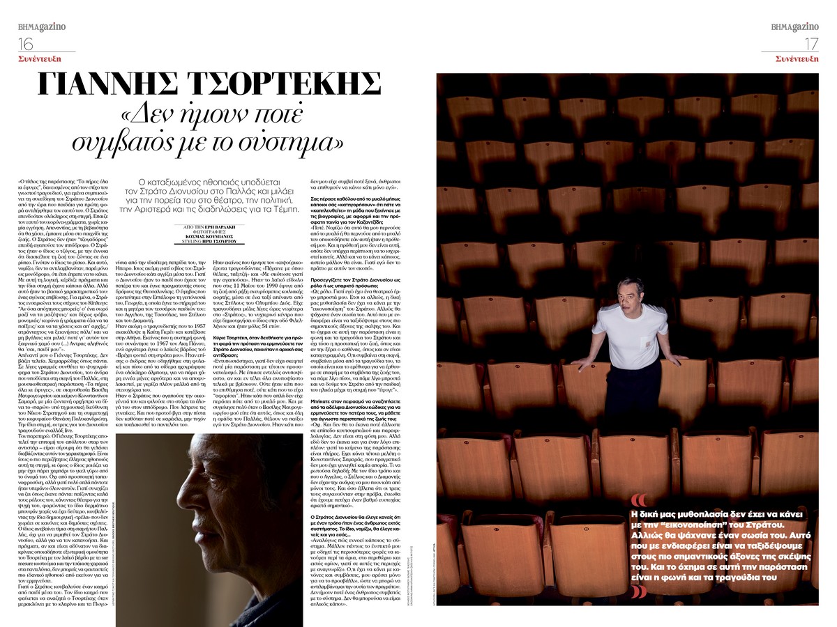 Ο Γιάννης Τσορτέκης υποδύεται στο θέατρο «Παλλάς» τον αείμνηστο λαϊκό βάρδο Στράτο Διονυσίου και μιλάει στο BHMAGAZINO για την πορεία του στο θέατρο, την πολιτική, την Αριστερά και τις διαδηλώσεις για τα Τέμπη.