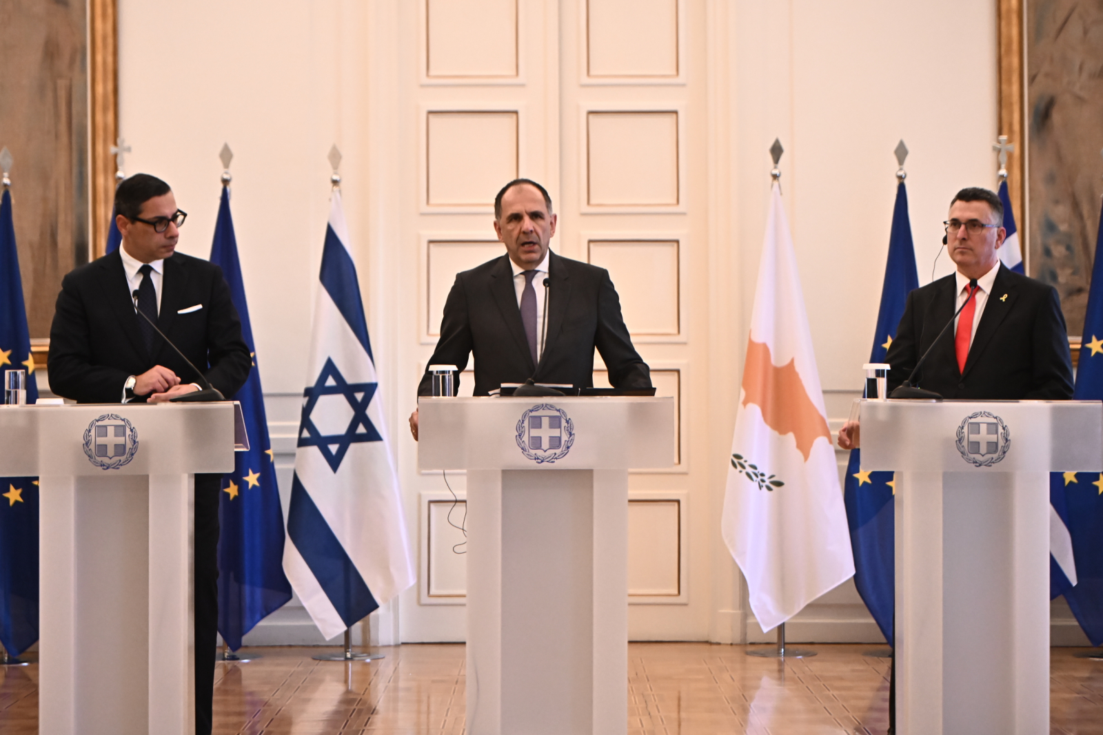 Θερμό ήταν το κλίμα στη τριμερή συνάντηση των υπουργών Εξωτερικών της Ελλάδας, της Κύπρου και του Ισραήλ, που έλαβε χώρα στην Αθήνα, την Πέμπτη. Στο επίκεντρο της συνάντησης βρέθηκε τόσο η ενεργειακή διασύνδεση των χωρών, όσο και η διεύρυνση του σχήματος με την επανενεργοποίηση του «3+1» και τη συμμετοχή των Ηνωμένων Πολιτειών. Ψηλά στην ατζέντα, βρέθηκε επίσης το Κυπριακό αλλά και η σημασία του οικονομικού διαδρόμου IMEC.