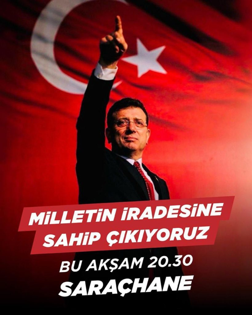 Την ίδια ώρα, πλήθος κόσμου βρίσκεται στους δρόμους και διαμαρτύρεται για τη σύλληψη του Εκρέμ Ιμάμογλου. Πολλοί άνθρωποι έχουν συγκεντρωθεί μπροστά από το δημαρχιακό μέγαρο στην Κωνσταντινούπολη, όπως φαίνεται και από τις φωτογραφίες. Παράλληλα, υπάρχουν εκκλήσεις μέσω αφισών να συγκεντρωθούν εκ νέου στις 20:30 στον ίδιο χώρο, διαμαρτυρόμενος για την σύλληψη του δημάρχου Κωνσταντινούπολης.