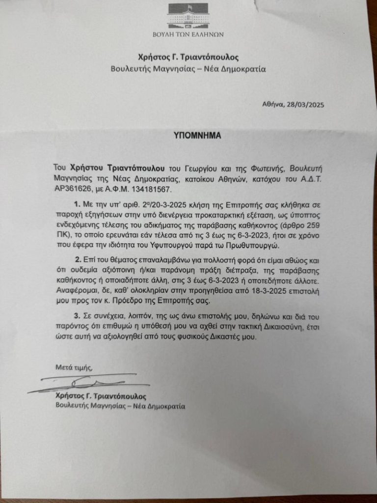 Σύμφωνα με τα όσα αναφέρει σε κάποιο σημείο του, ο Χρ. Τριαντόπουλος, «επαναλαμβάνω για πολλοστή φορά ότι είμαι αθώος και ότι ουδεμία αξιόποινη ή/και παράνομη πράξη διέπραξα, της παράβασης καθήκοντος ή οποιαδήποτε άλλη, στις 3 έως 6-3-2023 ή οποτεδήποτε άλλοτε».
