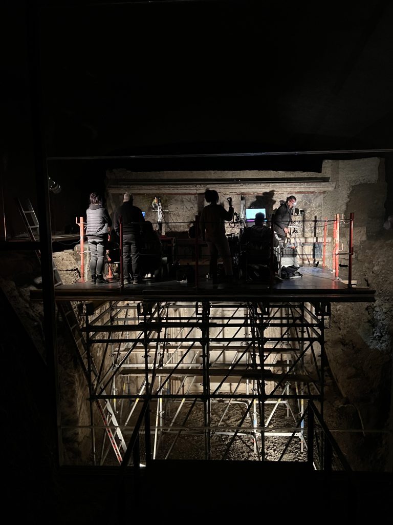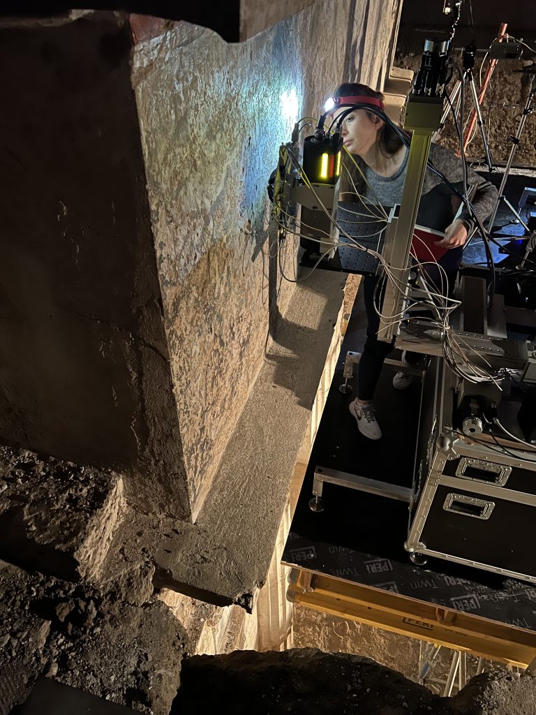 Αρχαιολογικός χώρος των Αιγών. Πρόσοψη Τάφου Φιλίππου Β’. Στοιχειακή σάρωση της επιφάνειας της τοιχογραφίας με φθορισμό ακτίνων Χ (MAXRF) από την ομάδα του εργαστηρίου XRAYlab, ISPC/CNR της Catania, Μάρτιος 2023 (Φωτ. Χρίστος Σιμάτος).