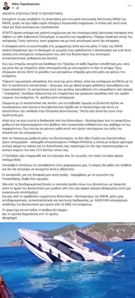 Ανάρτηση καταπέλτη κατά του βουλευτήριου της Νίκης το οποίο κατηγορεί ότι του επέβαλε τιμωρία για τον βανδαλισμό που διέπραξε στην Εθνική Πινακοθήκη, έκανε στο Facebook ο βουλευτής Νίκος Παπαδόπουλος, υποστηρίζοντας ότι οι αναρτήσεις του δεν δημοσιεύονται στα social media του κόμματος.