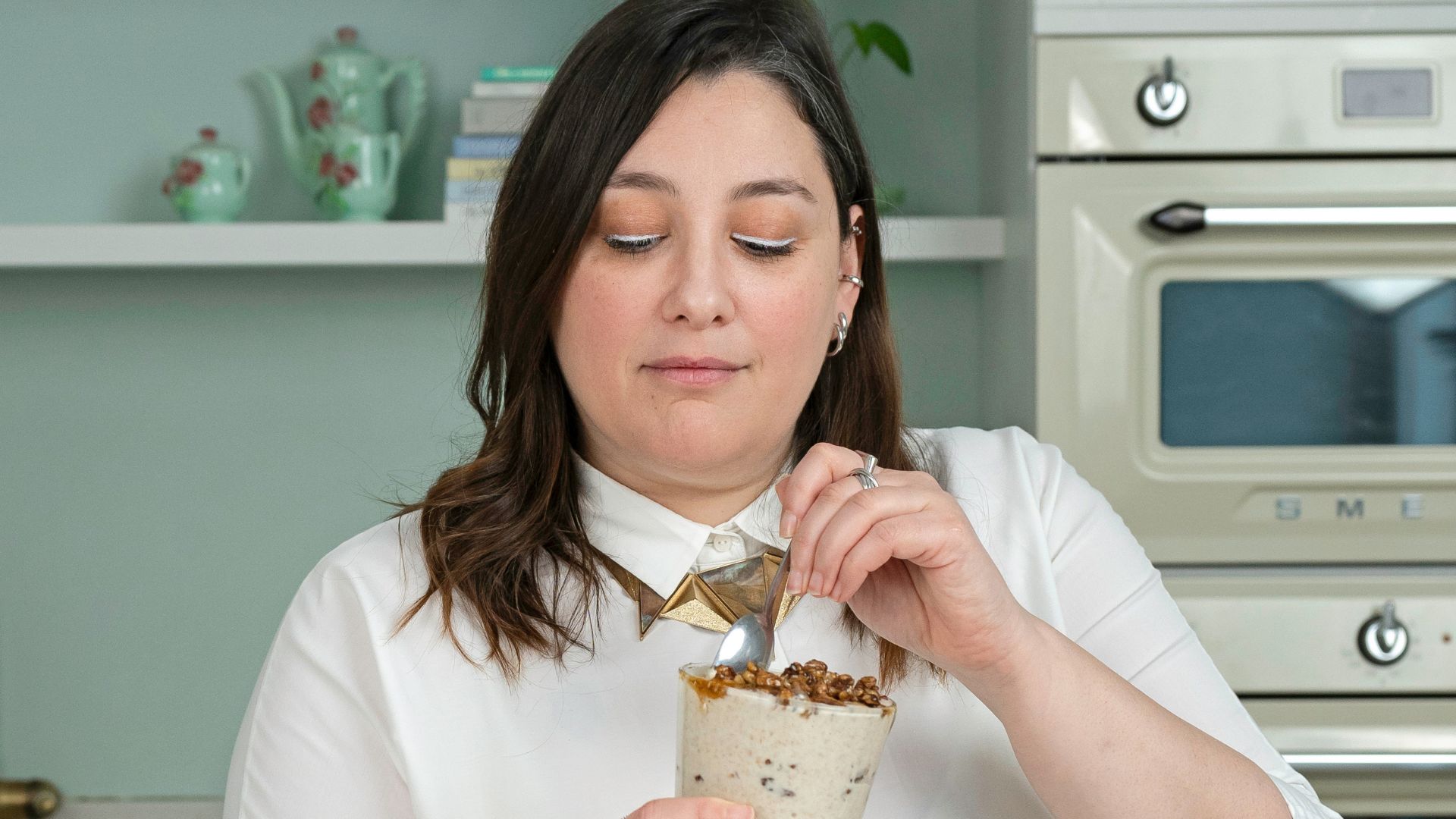 Την ενδιαφέρουν όμως και τα vegan υλικά, όπως και η πρόκληση του να παρασκευάζει γλυκά χωρίς ζωικά προϊόντα αλλά με αντίστοιχες με τα «κανονικά» υφές. Απολαμβάνει την ασιατική κουζίνα και να τρώει έξω, να επισκέπτεται καινούρια μαγαζιά και να δοκιμάζει τα πάντα, από χασαποταβέρνες μέχρι εστιατόρια με αστέρια Michelin. To δικό της κομμάτι του brunch –γλυκό και με άρωμα Ελλάδας– έχει ένα ψημένο γιαούρτι με σιρόπι από μανταρίνια Χίου και ένα μπολ βρόμης με γεύση μπακλαβά.