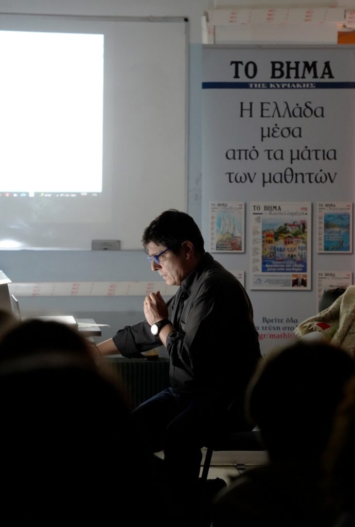 Στην συζήτηση συμμετείχαν η αρχισυντάκτρια της έντυπης έκδοσης του «Βήματος» Μάρνυ Παπαματθαίου, ο art director της εφημερίδας Γιάννης Κούρτης, ο αρχισυντάκτης της ηλεκτρονικής έκδοσης του «Βήματος» Βασίλης Σφήνας, η παρουσιάστρια ειδήσεων του Mega channel Στέλλα Στυλιανού, ενώ παρούσα στην συζήτηση ήταν και η εκπαιδευτικός τους και υπεύθυνη του δημοσιογραφικού τους Ομίλου Παρασκευή Σαρμπάνη. Στην κουβέντα αυτή χαιρέτισε η διευθύντρια του σχολείου Ευαγγελία Γεώργα, ενώ χαιρετισμό απηύθυνε και η αντιδήμαρχος Παιδείας και Δια Βίου Μάθησης του Δήμου Πειραιά Σίσσυ Αλιγιζάκη.