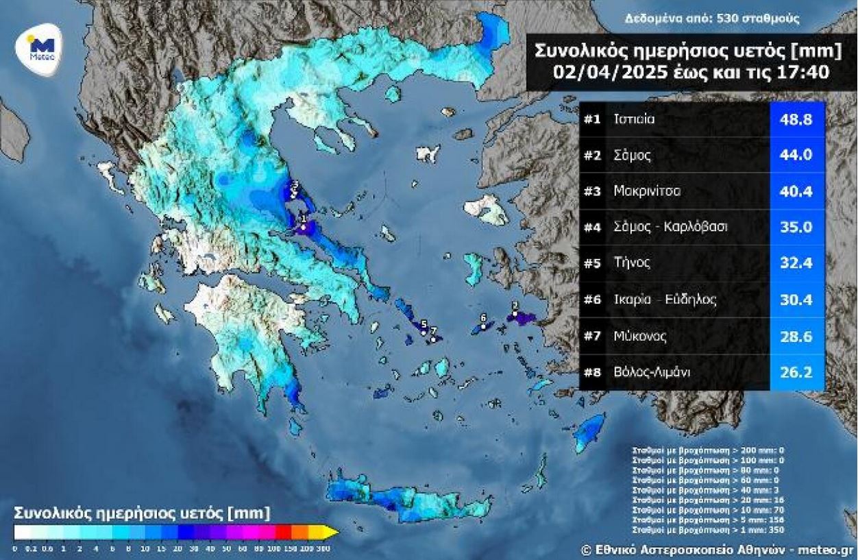 Σύμφωνα με τα στοιχεία του meteo.gr / Εθνικού Αστεροσκοπείου Αθηνών, οι σημαντικότερες βροχοπτώσεις κατά τη διάρκεια της Τετάρτης 02/04 σημειώθηκαν στην Ανατολική Ελλάδα. Το μεγαλύτερο ημερήσιο ύψος βροχόπτωσης έως τις 17:40 καταγράφεται στην Ιστιαία της Εύβοιας και ανέρχεται σε 48.8 χιλιοστά.
