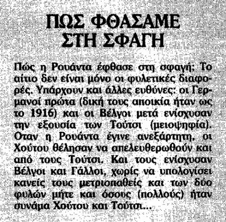 Στις 21 Αυγούστου 1994, «ΤΟ ΒΗΜΑ» επιχειρεί να φωτίσει το πολιτιστικό και γεωγραφικό υπόβαθρο της σύγκρουσης ανάμεσα σε Χούτου και Τούτσι: