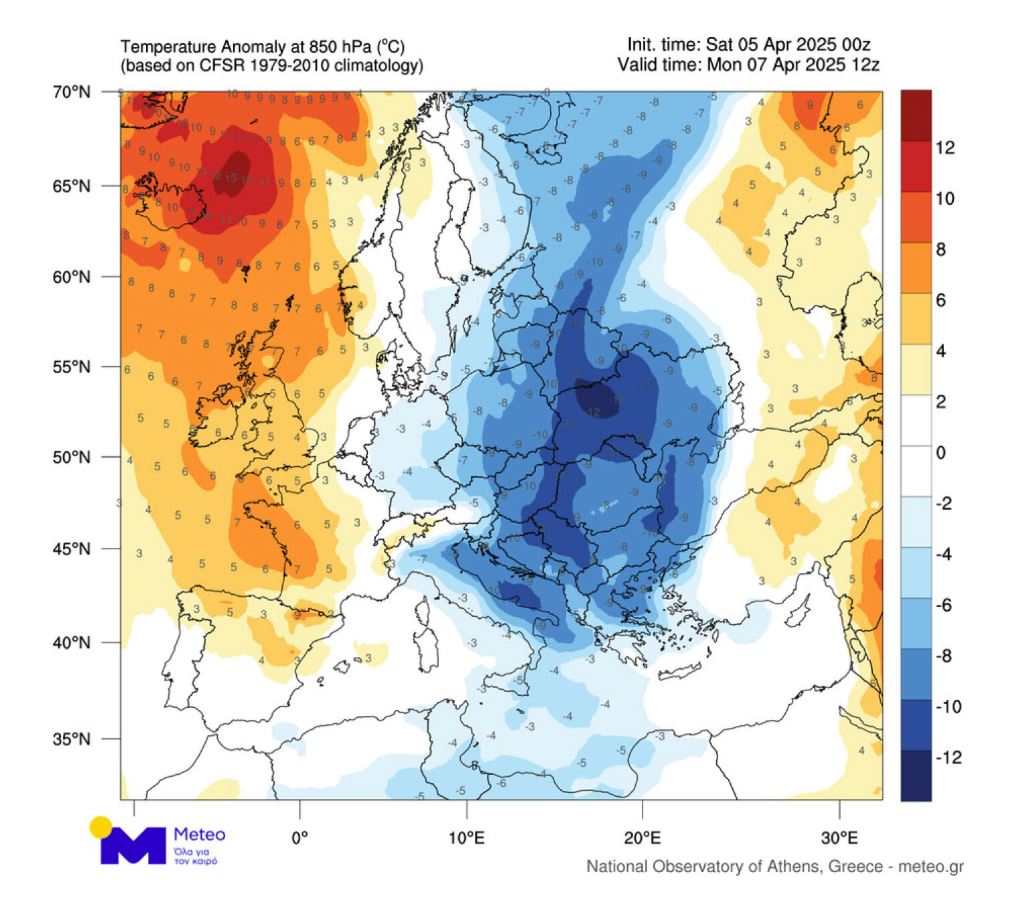 Δ. Αισθητή πτώση της θερμοκρασίας από το απόγευμα της Κυριακής στη Μακεδονία και τη Θράκη και βαθμιαία τη Δευτέρα και την Τρίτη στην κεντρική και τη νότια Ελλάδα. Παγετός στη βόρεια χώρα τις βραδινές ώρες της Δευτέρας (07-04-2025) και στο εσωτερικό όλης της ηπειρωτικής Ελλάδας τις πρωινές και βραδινές ώρες της Τρίτης και της Τετάρτης και τις πρωινές ώρες της Πέμπτης.