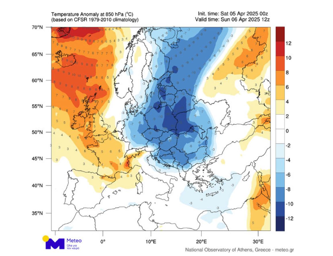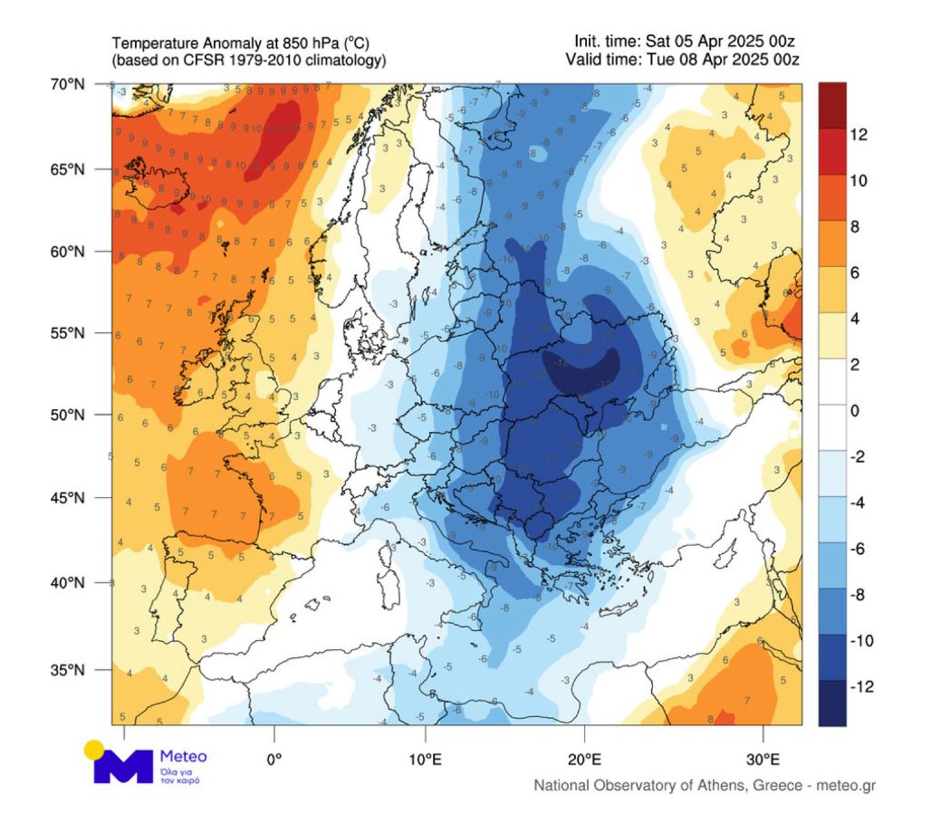Στις εικόνες που ακολουθούν παρουσιάζεται η απόκλιση της θερμοκρασίας των αερίων μαζών σε ύψος 1500 μέτρων από τη μέση στάθμη της θάλασσας από την Κυριακή 06/04 έως την Τρίτη 08/04. Όπως διακρίνουμε, οι ψυχρές αέριες μάζες που θα επηρεάσουν τη χώρα θα είναι κατά τόπους έως και 10 με 12°C ψυχρότερες από τις κανονικές για την εποχή.