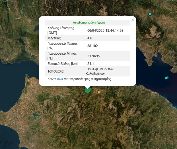 Σύμφωνα με την Αναθεωρημένη Λύση του Γεωδυναμικού Ινστιτούτου, η σεισμική δόνηση σημειώθηκε στις 18:44, 15 χλμ δυτικά- βορειοδυτικά των Καλαβρύτων, με εστιακό βάθος 24 χλμ.