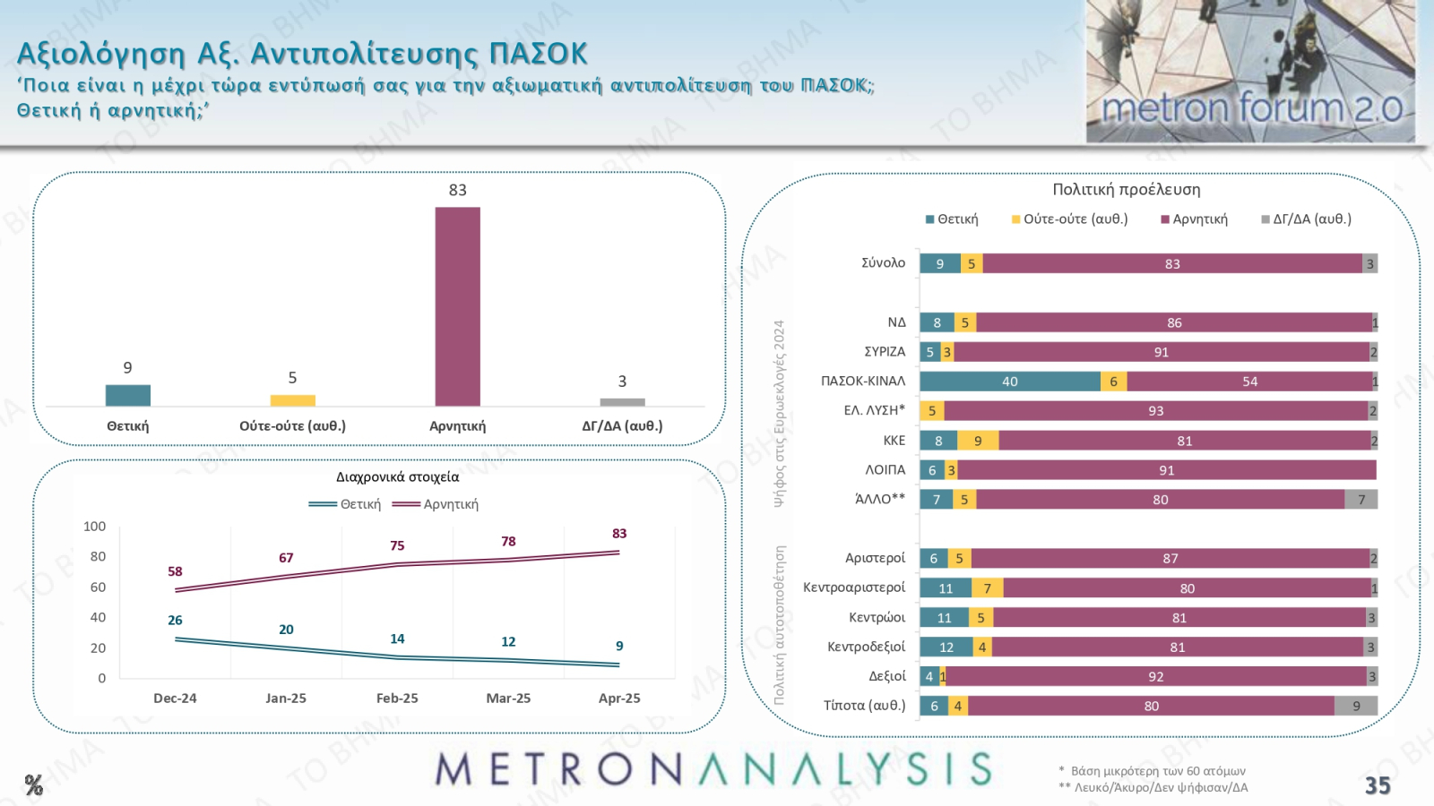 Τα συγκεκριμένα ποσοστά είναι τα χειρότερα για το ΠαΣοΚ από τον περασμένο Δεκέμβριο, ενώ μέσα σε τέσσερις μήνες οι αρνητικές γνώμες εκτοξεύτηκαν από το 67% στο 83%.