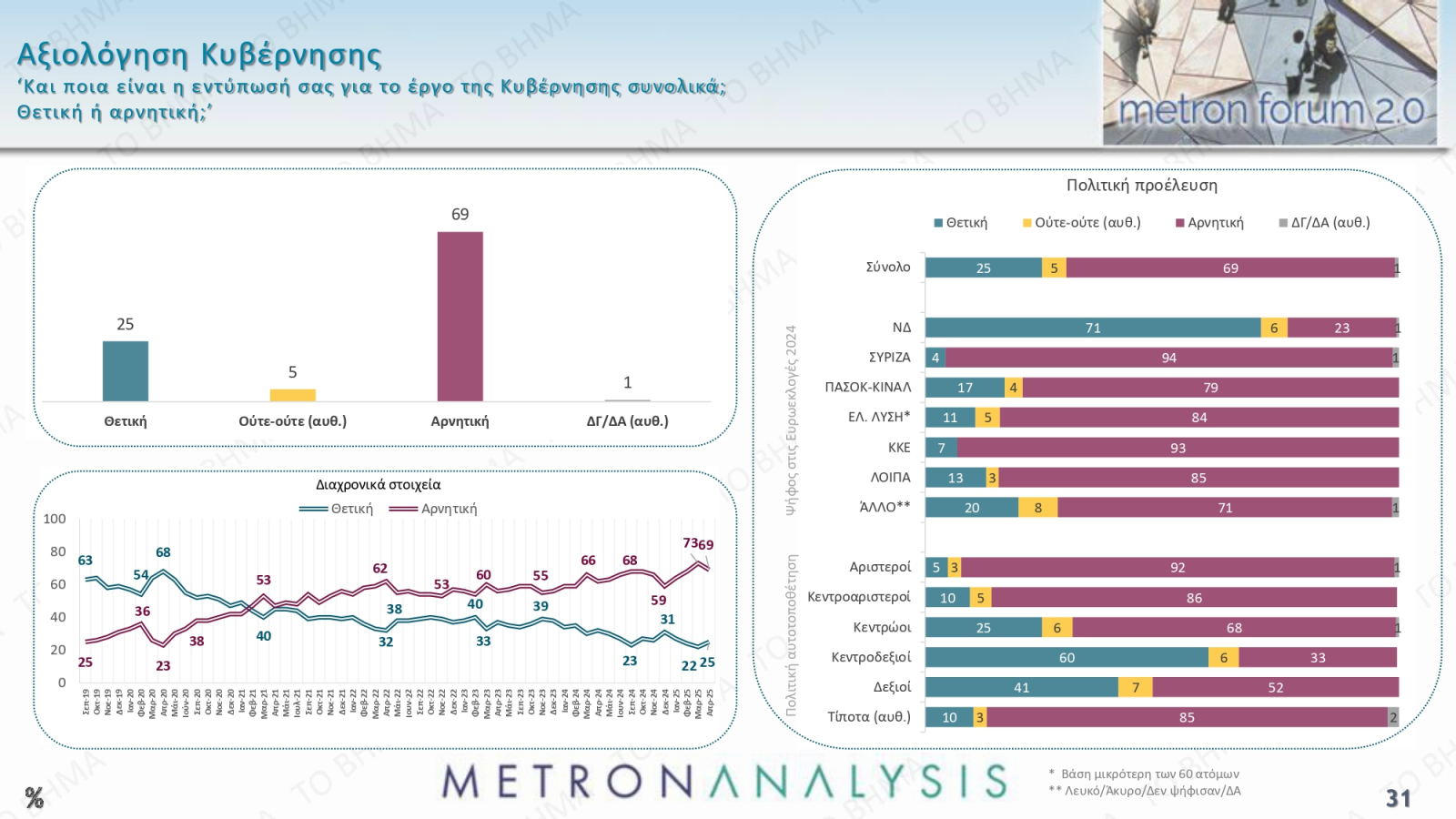 Το 69% των πολιτών έχει αρνητική γνώμη για το έργο της Κυβέρνησης. Ένα ποσοστό που είναι ελαφρώς βελτιωμένο σε σχέση με πριν από ένα μήνα που έφτανε στο 73%. Αντίθετα, οι θετικές γνώμες είναι στο 25%.