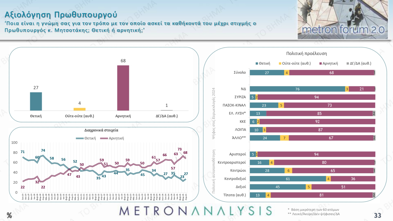 Ανάλογη είναι η εικόνα και στην αξιολόγηση του πρωθυπουργού. Το 68% έχει αρνητική γνώμη για τον τρόπο που ασκεί τα καθήκοντά του, ενώ το 27 έχει θετική. Στα αξιοσημείωτα το γεγονός ότι μόνο οι ψηφοφόροι της Νέας Δημοκρατίας έχουν θετική γνώμη για το έργο του.