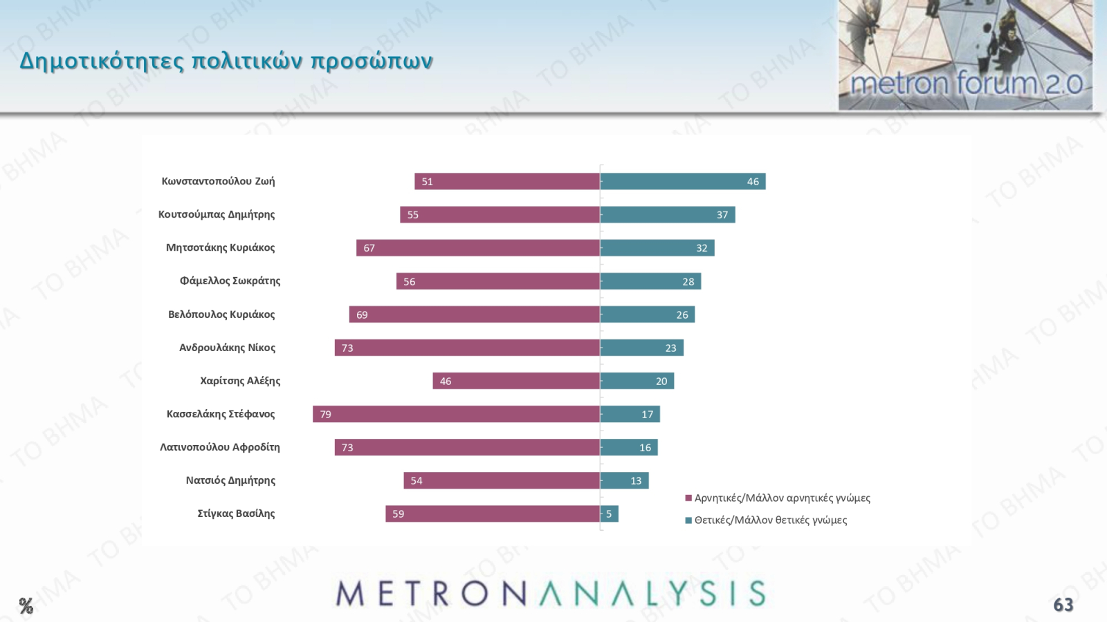 Στο ερώτημα για τη δημοτικότητα των πολιτικών προσώπων η Ζωή Κωνσταντοπούλου έρχεται πρώτη με 46% και ακολουθούν ο Δημήτρης Κουτσούμπας με 37% και ο Κυριάκος Μητσοτάκης με 32%. Στα αξιοσημείωτα το γεγονός ότι για κανέναν από αυτούς δεν υπάρχει ξεκάθαρα θετική άποψη.