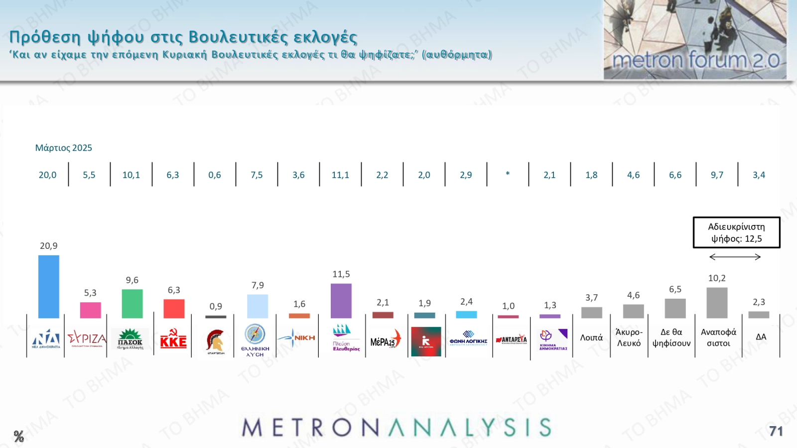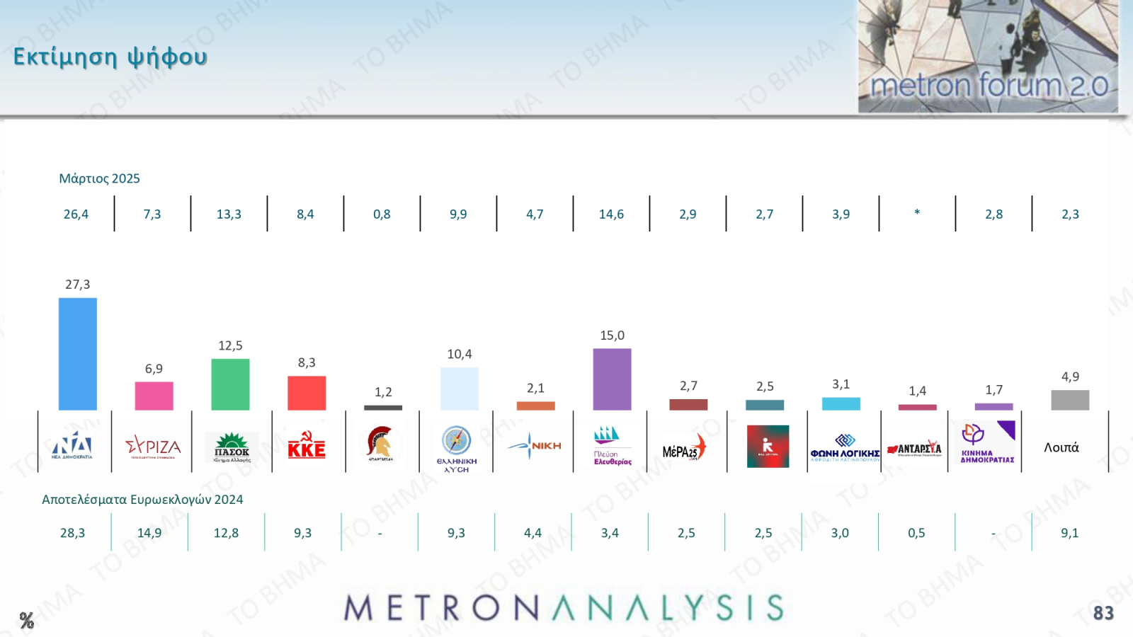 Η Νέα Δημοκρατία κυριαρχεί τόσο στην πρόθεση ψήφου όσο και στην εκτίμηση. Μάλιστα, αυξάνει τα ποσοστά της. Στη πρόθεση ψήφου συγκεντρώνει 20,9% ενισχυμένη κατά σχεδόν μια ποσοστιαία μονάδα, με την Πλεύση Ελευθερίας να είναι δεύτερη με 11,5%.