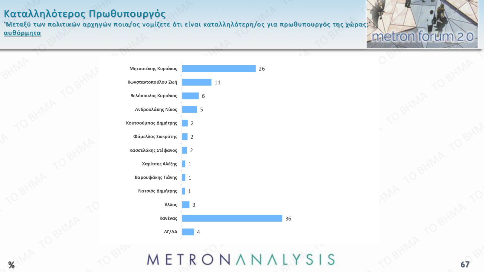 Ο «κανένας» εξακολουθεί να είναι η κορυφαία επιλογή των πολιτών για τον καταλληλότερο πρωθυπουργό συγκεντρώνοντας το 36% των προτιμήσεων. Την ίδια ώρα ο Κυριάκος Μητσοτάκης είναι πρώτος από τους υπόλοιπους με 26%.