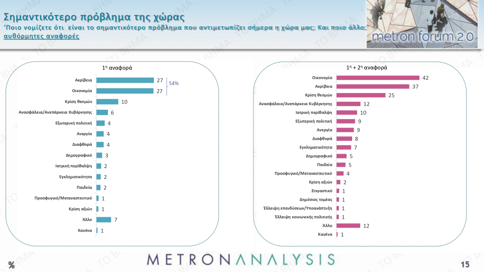 Η ακρίβεια και γενικότερα η οικονομία αποτελούν τα μεγαλύτερα προβλήματα που αντιμετωπίζουν οι πολίτες αγγίζοντας αθροιστικά το 54%. Aκολουθούν η κρίση των θεσμών, ενώ αξιοσημείωτη άνοδο παρουσιάζουν η ανασφάλεια / ανεπάρκεια της κυβέρνησης.