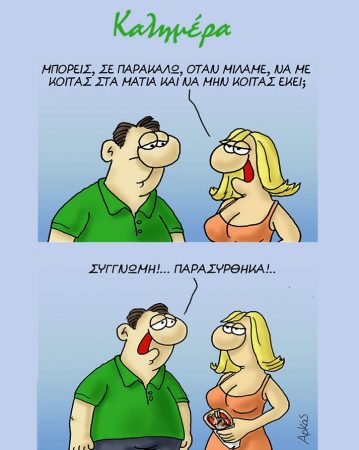 Σήμερα, Πέμπτη 10 Απριλίου 2025 σκιτσάρει ένα ζευγάρι που το ένα μέλος του στέκεται αντικριστά στο άλλο. Ο άνδρας κοιτά τη γυναίκα αρκετά «λαίμαργα» αλλά όχι στα μάτι. Εκείνη τον επιπλήττει δίνοντας σε όλους μας μια εντύπωση η οποία τελικά διαψεύδεται, αν κανείς δει το δεύτερο καρέ του σκίτσου του διάσημου σκιτσογράφου.