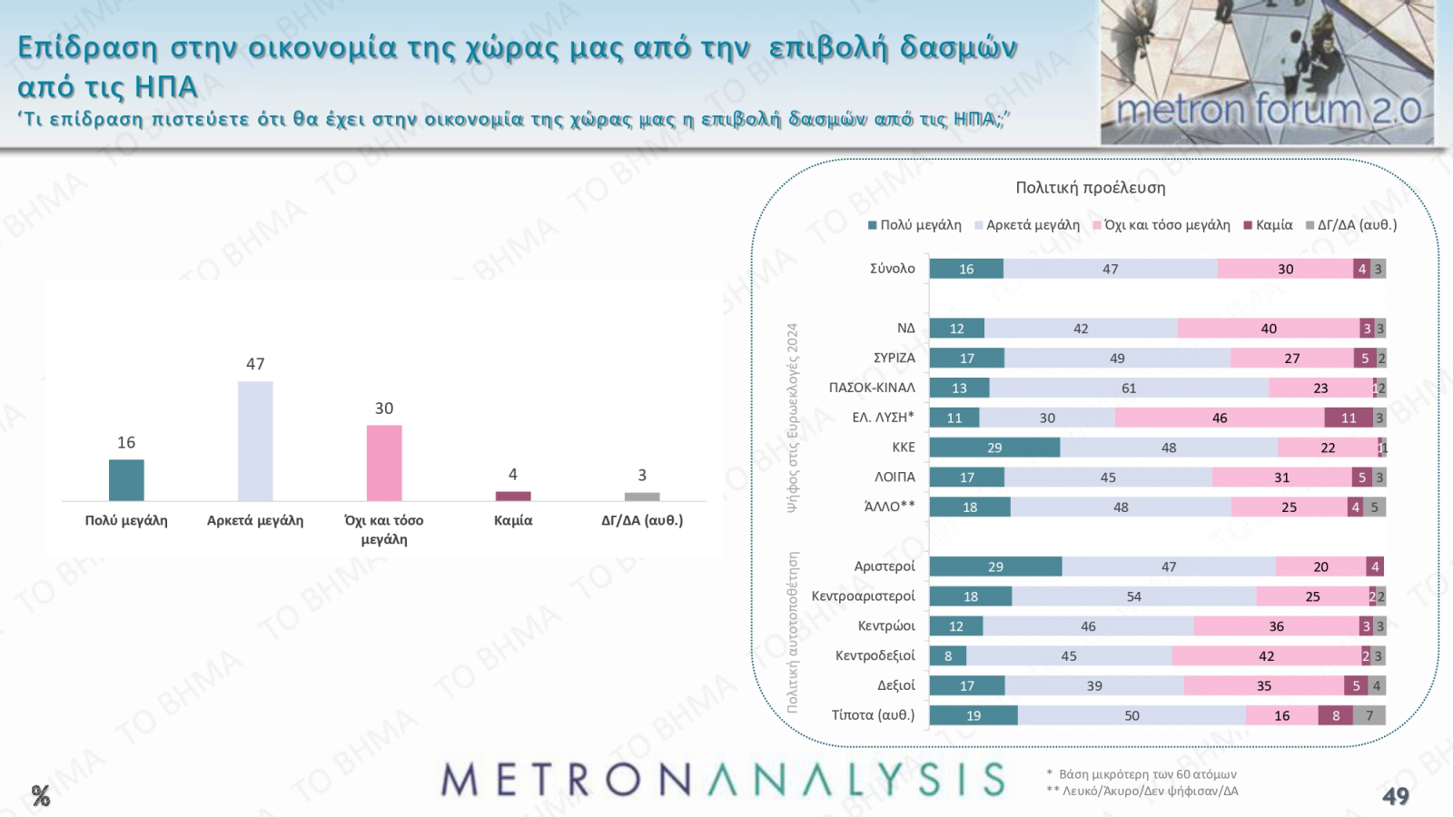 Την ίδια ώρα η πλειοψηφία των πολιτών πιστεύει ότι η επιβολή δασμών από τις ΗΠΑ θα έχει μεγάλη ή πολύ μεγάλη επίδραση την οικονομία της Ελλάδας. Το 47% πιστεύει ότι θα έχει αρκετά μεγάλη, ενώ το 16% πολύ μεγάλη. Το 30% πιστεύει ότι δε θα έχουν τόσο μεγάλη, ενώ μόλις το 4% πιστεύει ότι δε θα υπάρξει καμία επίπτωση.
