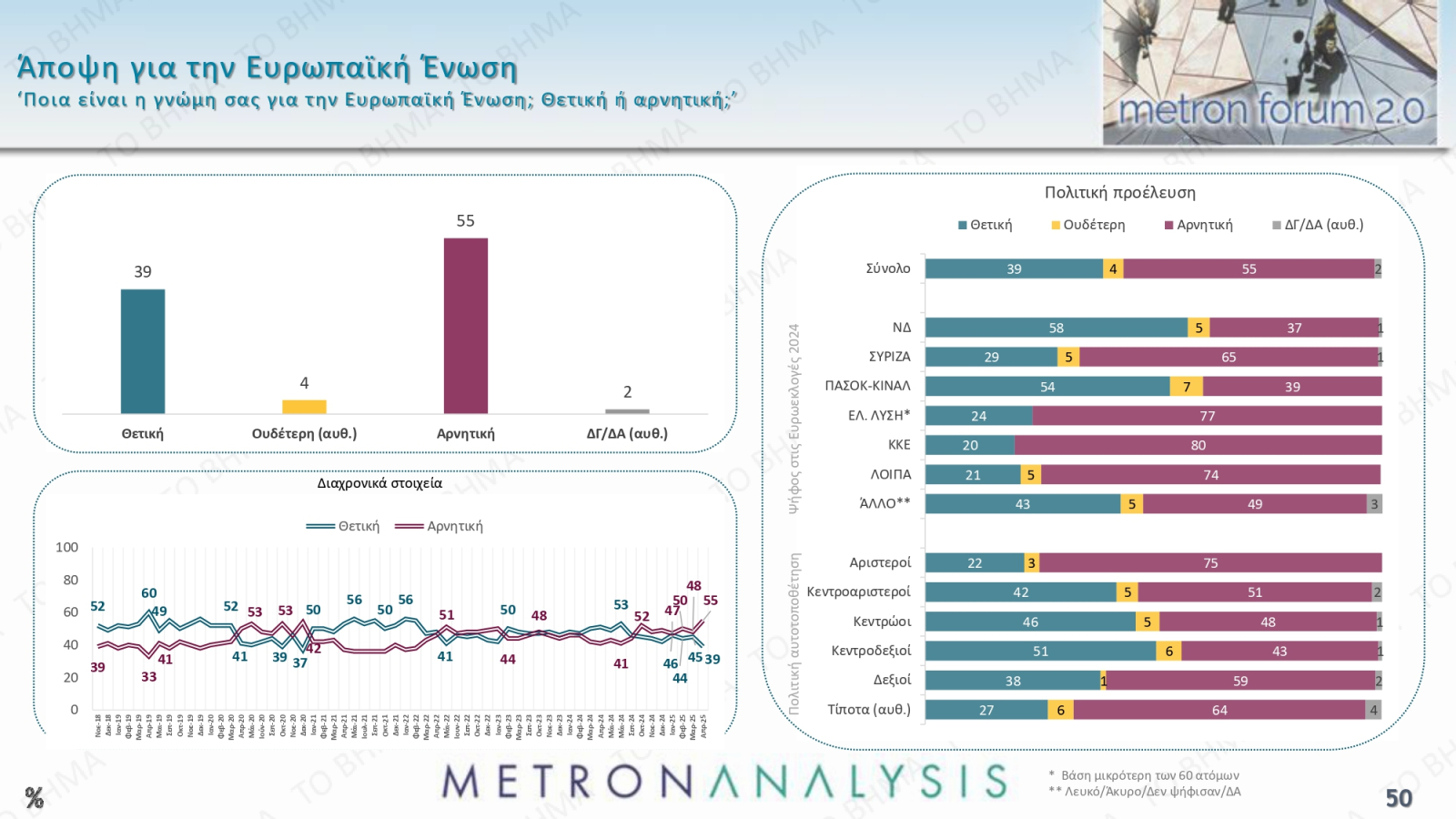 Σε ανάλογες ερωτήσεις για την Ε.Ε. κλήθηκαν να απαντήσουν οι πολίτες. Η πλειοψηφία έχει αρνητική άποψη για εκείνη με το ποσοστό να φτάνει στο 55%, ενώ οι θετικές γνώμες είναι στο 39%. Το 55% είναι το υψηλότερο αρνητικό ποσοστό που είχε ποτέ η ΕΕ από τον Νοέμβριο του 2018 μέχρι και σήμερα.