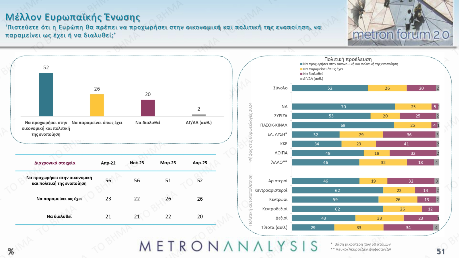 Μεγάλο ενδιαφέρον παρουσιάζουν οι απαντήσεις που δόθηκαν σχετικά με το μέλλον της ΕΕ. Η πλειοψηφία των πολιτών ζητά να προχωρήσει στην οικονομική και πολιτική ενοποίησή της, ενώ το 26% ζητά να παραμείνει όπως έχει, ενώ μόλις το 20% να διαλυθεί.