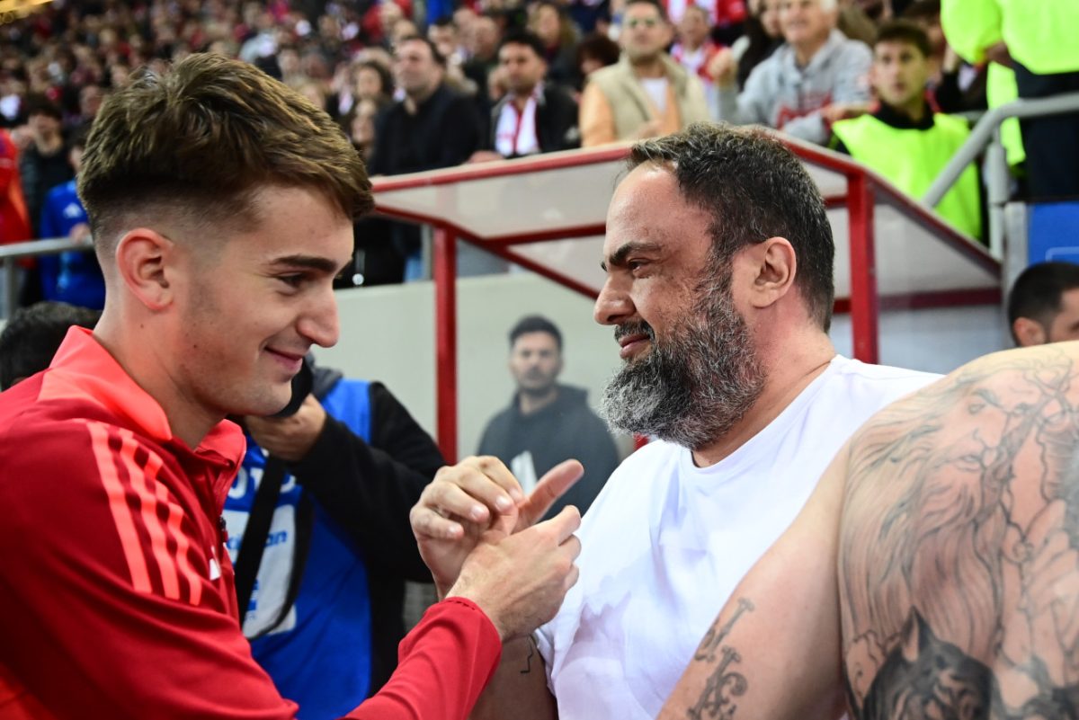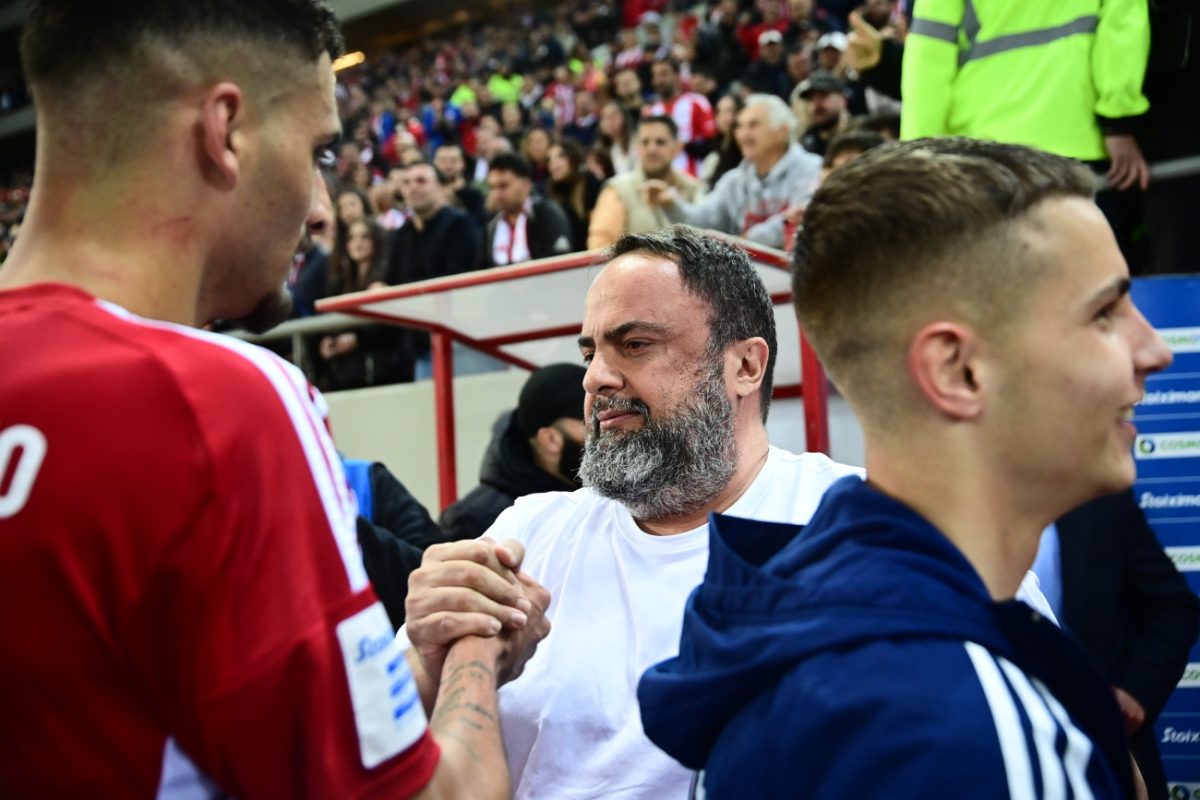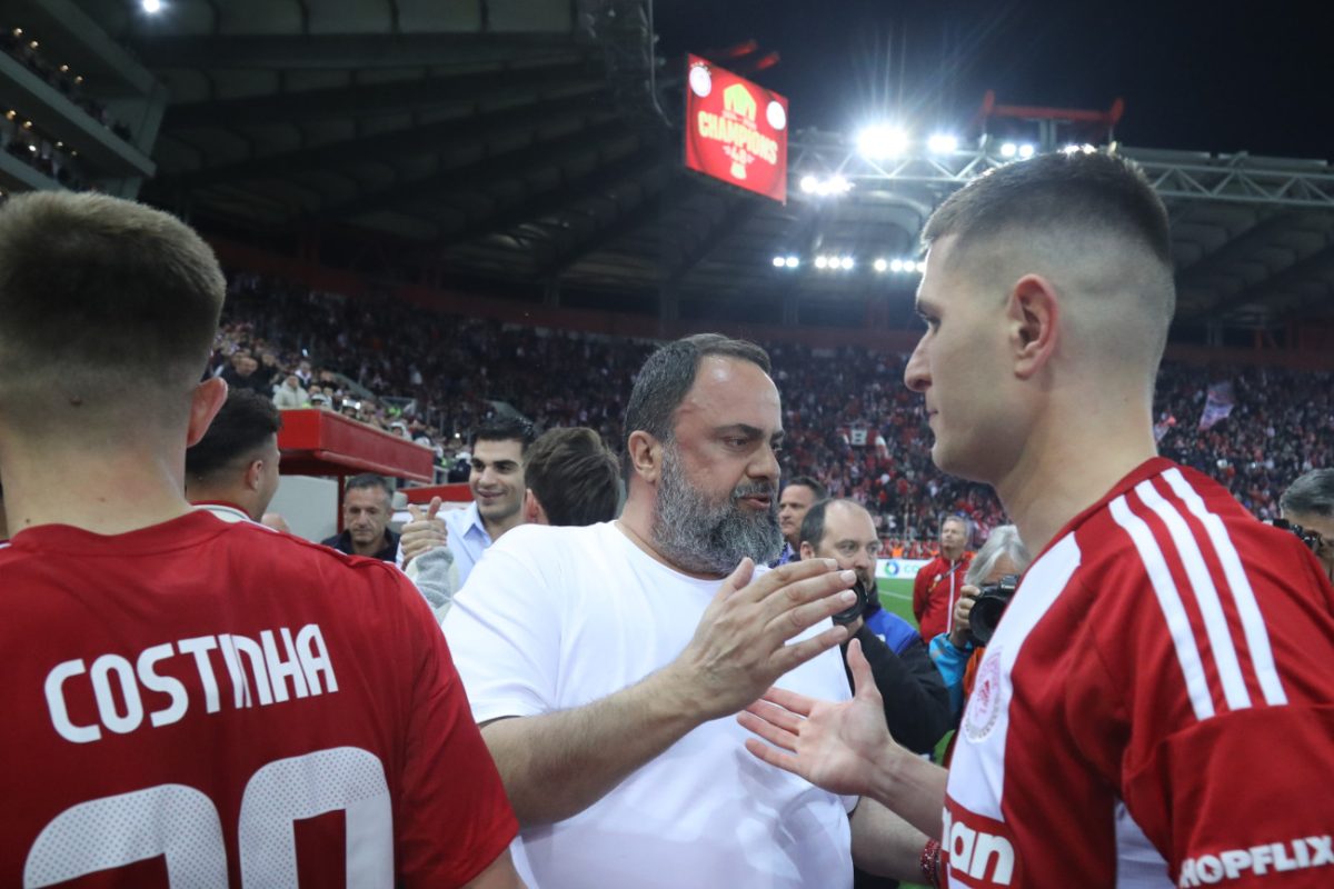 Μετά το τέλος του αγώνα, ομάδα και κόσμος πανηγύρισαν με την ψυχή τους τον τίτλο και φυσικά ο ηγέτης του Ολυμπιακού, Βαγγέλης Μαρινάκης, ήταν στο επίκεντρο των πανηγυρισμών. Πανευτυχής και αυτός, αμέσως βρέθηκε δίπλα στην ομάδα και συνεχάρη έναν έναν τους πρωταθλητές Ελλάδας, αγκαλιάζοντάς τους πριν φύγουν για τα αποδυτήρια.