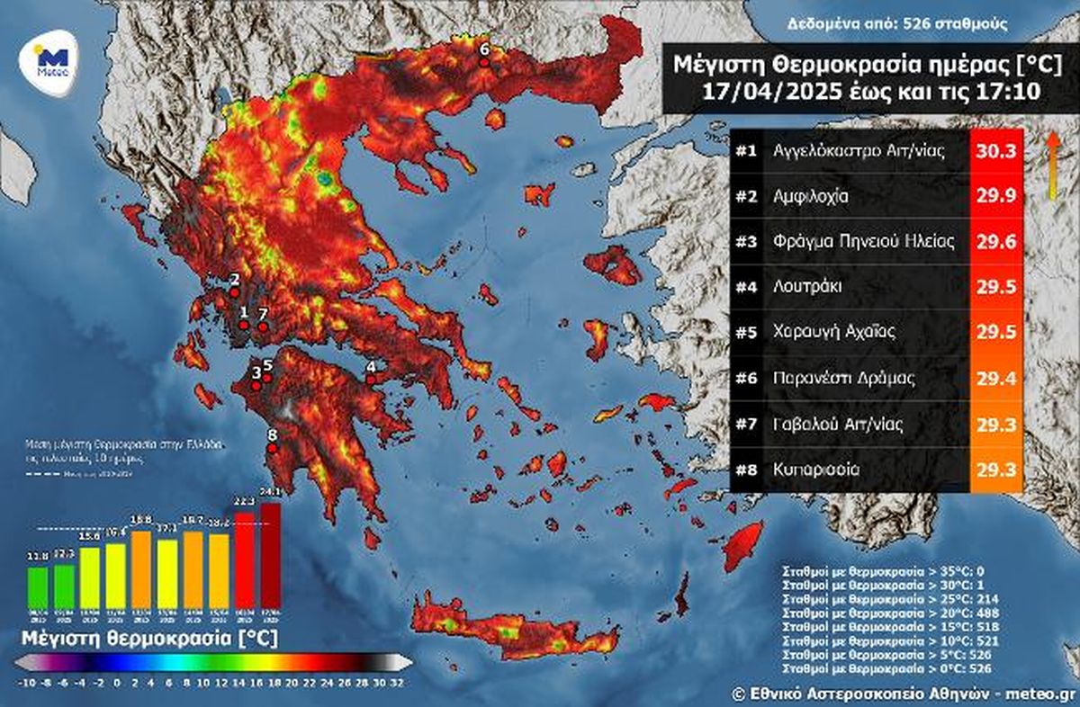 Στον παρακάτω χάρτη αποτυπώνονται οι μέγιστες θερμοκρασίες έως τις 17:10 της Μεγάλης Πέμπτης 17/04, ενώ στον πίνακα παρουσιάζονται οι 8 υψηλότερες μέγιστες τιμές από 526 μετεωρολογικούς σταθμούς του δικτύου αυτόματων μετεωρολογικών σταθμών του Εθνικού Αστεροσκοπείου Αθηνών/meteo.gr.