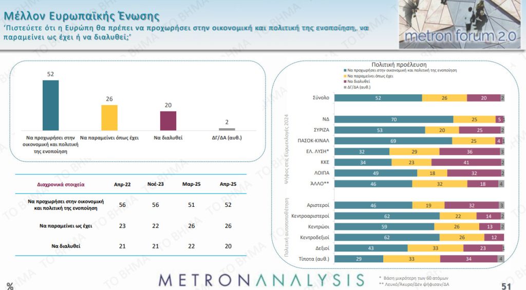 Στην αντίπερα όχθη, η πλειοψηφία των πολιτών επιθυμεί η Ευρωπαϊκή Ένωση να προχωρήσει στην οικονομική και πολιτική της ενοποίηση, με τα ποσοστά να είναι πολύ μεγάλα μεταξύ των ψηφοφόρων της ΝΔ, του ΠαΣοΚ και του ΣΥΡΙΖΑ και αντιστοίχως όσων δηλώνουν κεντροαριστεροί, κεντρώοι και κεντροδεξιοί.