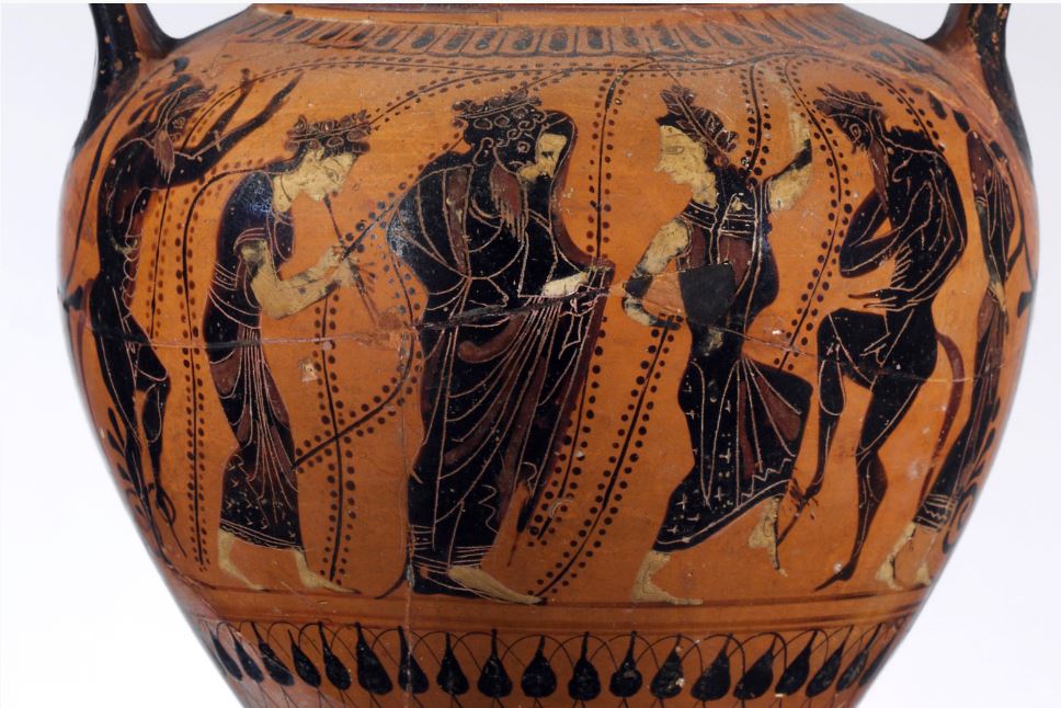 Ο χορός της Αριάδνης με την ίδια το Διόνυσο, Σάτυρους και Μαινάδες. Μελανόμορφος αμφορέας με λαιμό. περίπου 600-575 π.Χ. Νέα Υόρκη, Μητροπολιτικό Μουσείο, 96.9.9