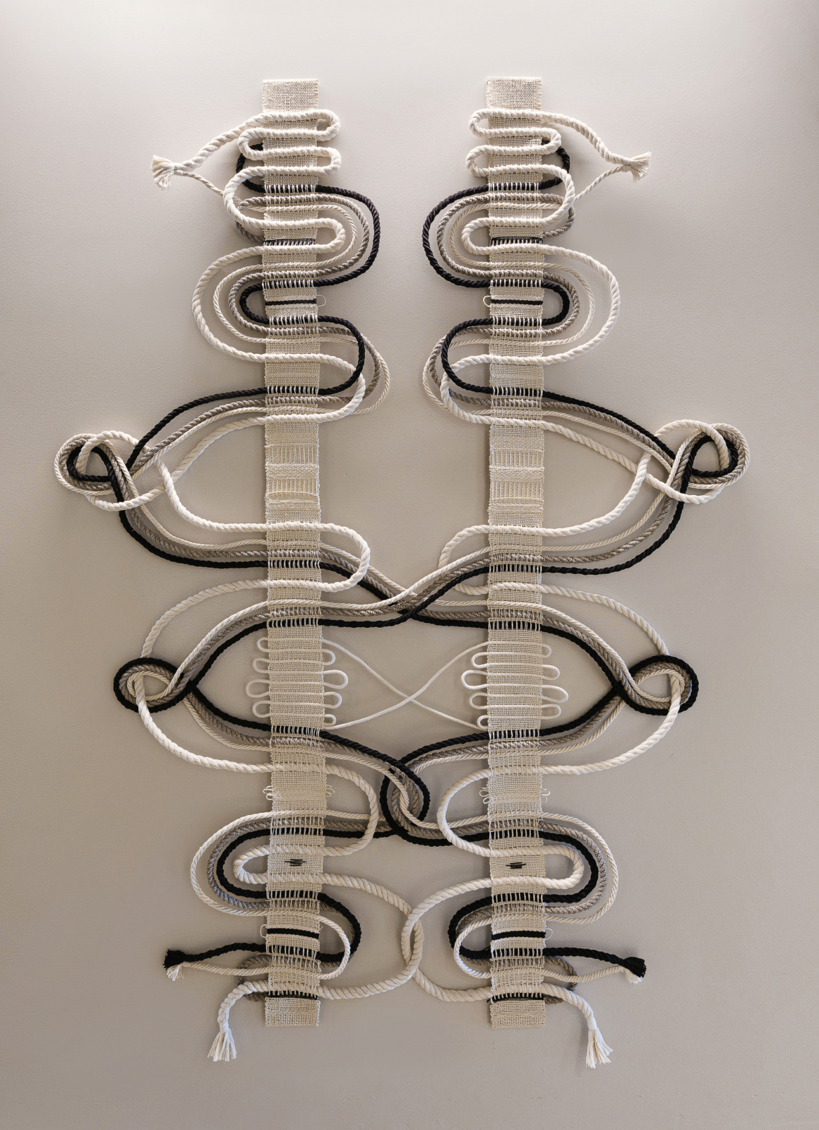 Η παραδοσιακή κορδονοποιία είναι μια από τις πολλές τεχνικές της passementerie. Η Κατερίνα στο έργο της υπερβαίνει την κλίμακα και παρουσιάζει το επιτοίχιο γλυπτό της από μεγάλου μεγέθους passementerie, υφασμένα με χειροποίητα κορδόνια σε παραδοσιακό αργαλειό.