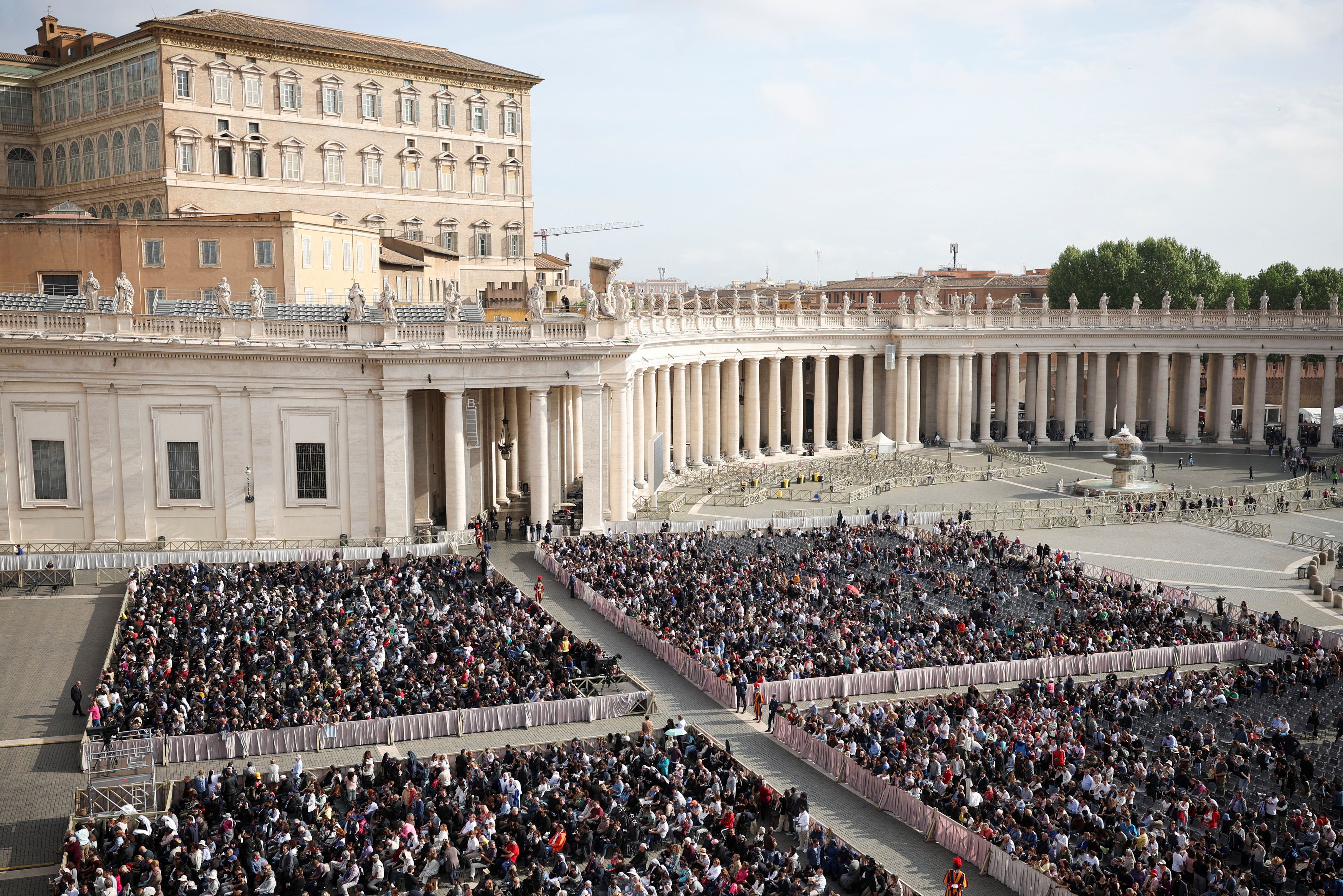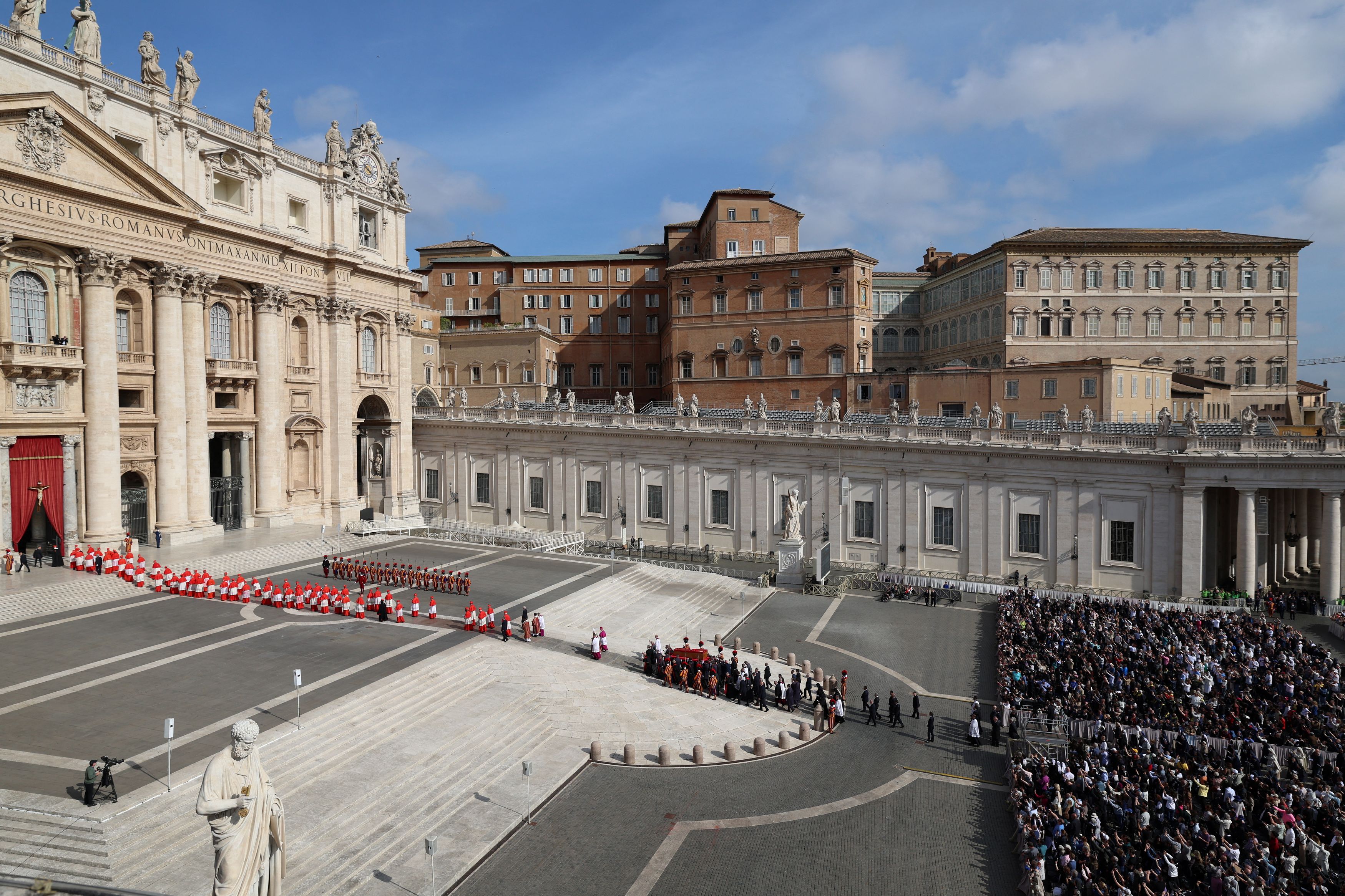 Η πλατεία του Αγίου Πέτρου είναι ηλιόλουστη. Οι καμπάνες της εκκλησίας χτυπούν και μια γιγάντια οθόνη έδειχνε το φέρετρο του Πάπα να μεταφέρεται από την Κάζα Σάντα Μάρτα, όπου πέθανε, στη Βασιλική του Αγίου Πέτρου.