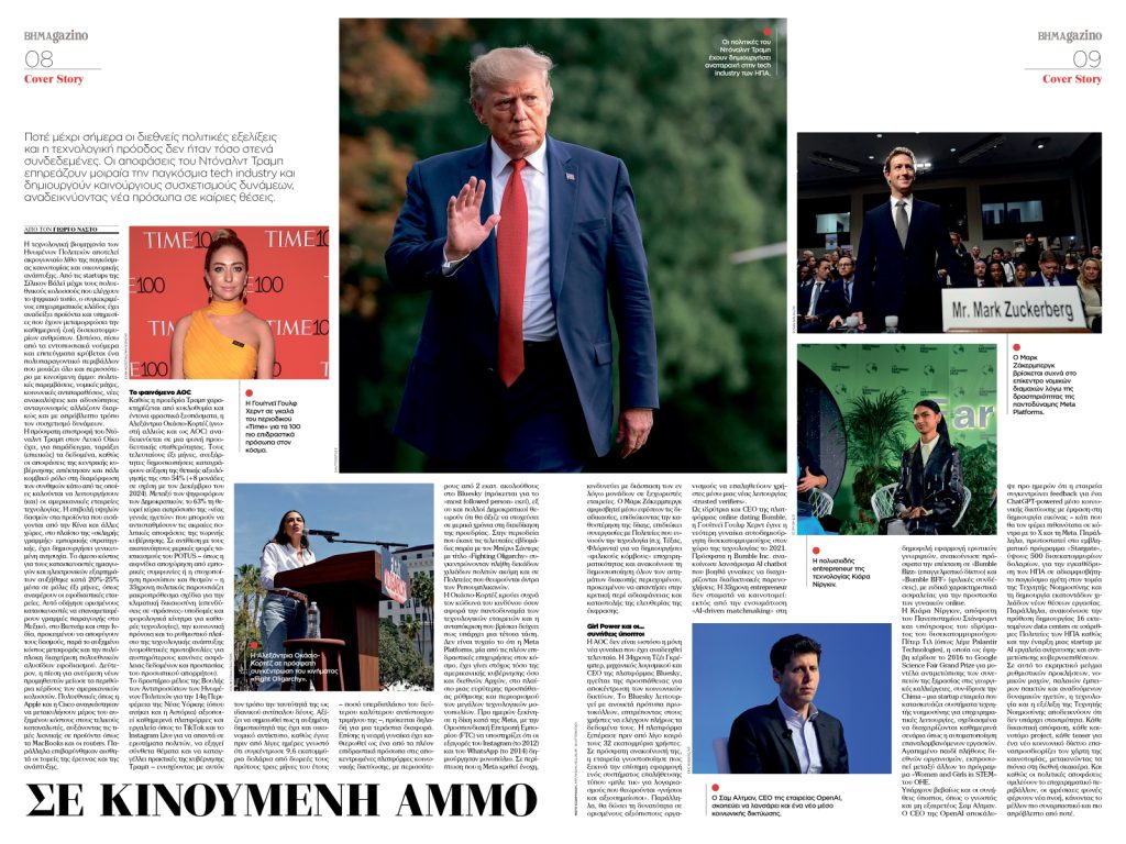 Στο BHMAGAZINO που κυκλοφορεί αυτή την Κυριακή 27 Απριλίου με την εφημερίδα ΤΟ ΒΗΜΑ θα διαβάσουμε για τον νέο συσχετισμό δυνάμεων στην παγκόσμια tech industry όπως αυτή διαμορφώνεται από τις αποφάσεις του Προέδρου των Η.Π.Α. Ντόναλντ Τραμπ. Ποτέ άλλωστε οι διεθνείς πολιτικές εξελίξεις δεν ήταν τόσο στενά συνδεδεμένες με την τεχνολογική πρόοδο. Ποια είναι τα νέα πρόσωπα που αναδεικνύονται σε καίριες θέσεις;