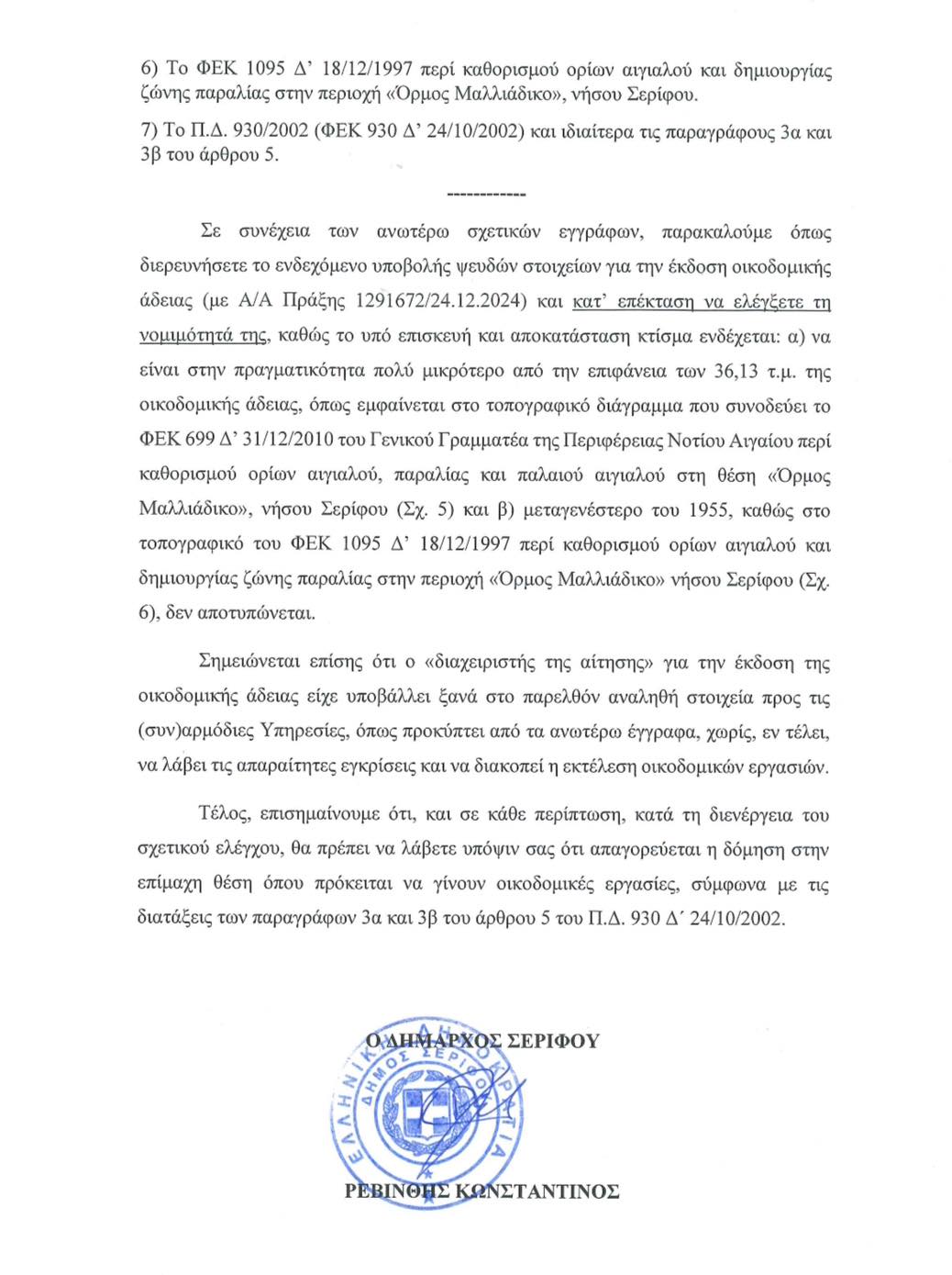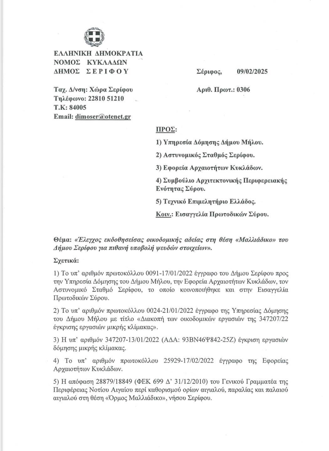 «Σε συνέχεια των ανωτέρω εγγράφων παρακαλούμε όπως διερευνήσετε το ενδεχόμενο υποβολής ψευδών στοιχείων για την έκδοση οικοδομικής άδειας (με Α.Α. Πράξης 1291672/24.12.2024) και κατ επέκταση να ελέγξετε τη νομιμότητά της, καθώς το υπό επισκευή και αποκατάσταση κτίσμα ενδέχεται: α) να είναι στην πραγματικότητα πολύ μικρότερο από την επιφάνεια των 36,13τ.μ. της οικοδομικής άδειας, όπως εμφαίνεται στο τοπογραφικό διάγραμμα που συνοδεύει το ΦΕΚ 699 Δ’ 31/12/2010 του Γενικού Γραμματέα της Περιφέρειας Νοτίου Αιγαίου περί καθορισμού ορίων αιγιαλού, παραλίας και παλαιού αιγιαλού στη θέση «Όρμος Μαλλιάδικο» νήσου Σερίφου και β) μετεγενέστερο του 1955, καθώς στο τοπογραφικό του ΦΕΚ 1095 Δ’ 18/12/1997 περί καθορισμού ορίων αιγιαλού και δημιουργίας ζώνης παραλίας στην περιοχή «Όρμος Μαλλιάδικο» νήσου Σερίφου δεν αποτυπώνεται.